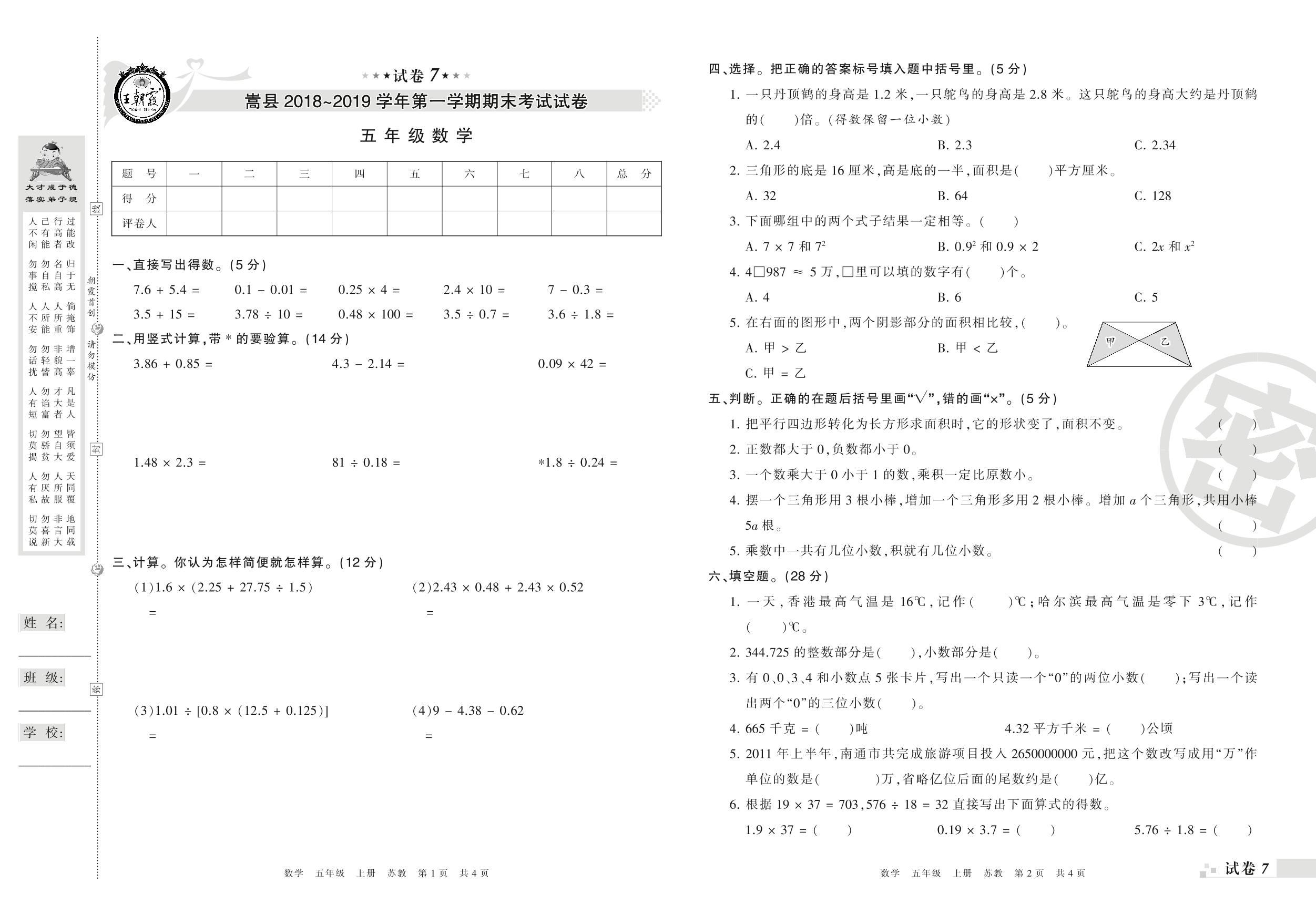 2018-2019学年第一学期洛阳市嵩县五年级数学试卷(苏教版)【7】