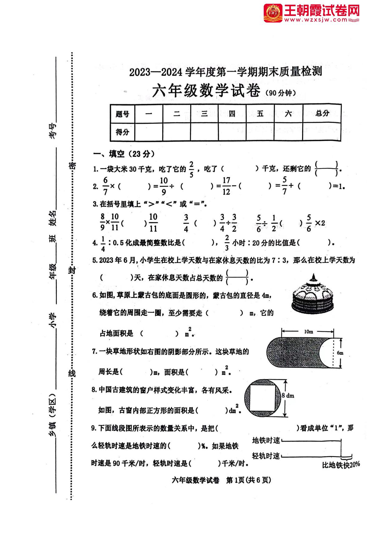 河北省秦皇岛市昌黎县2023-2024学年度第一学期期末质量检测六年级数学(人教版)