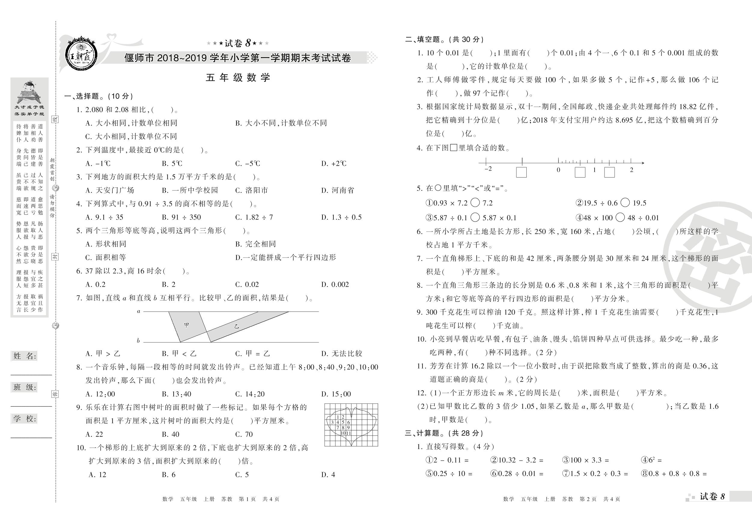 2018-2019学年第一学期偃师市五年级数学试卷(苏教版)【8】