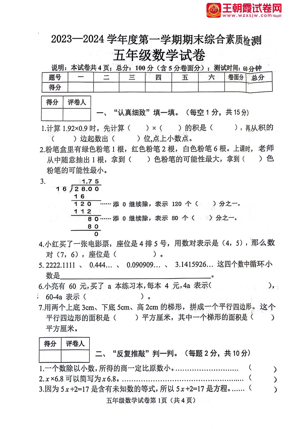 五年级数学人教版上册期末卷