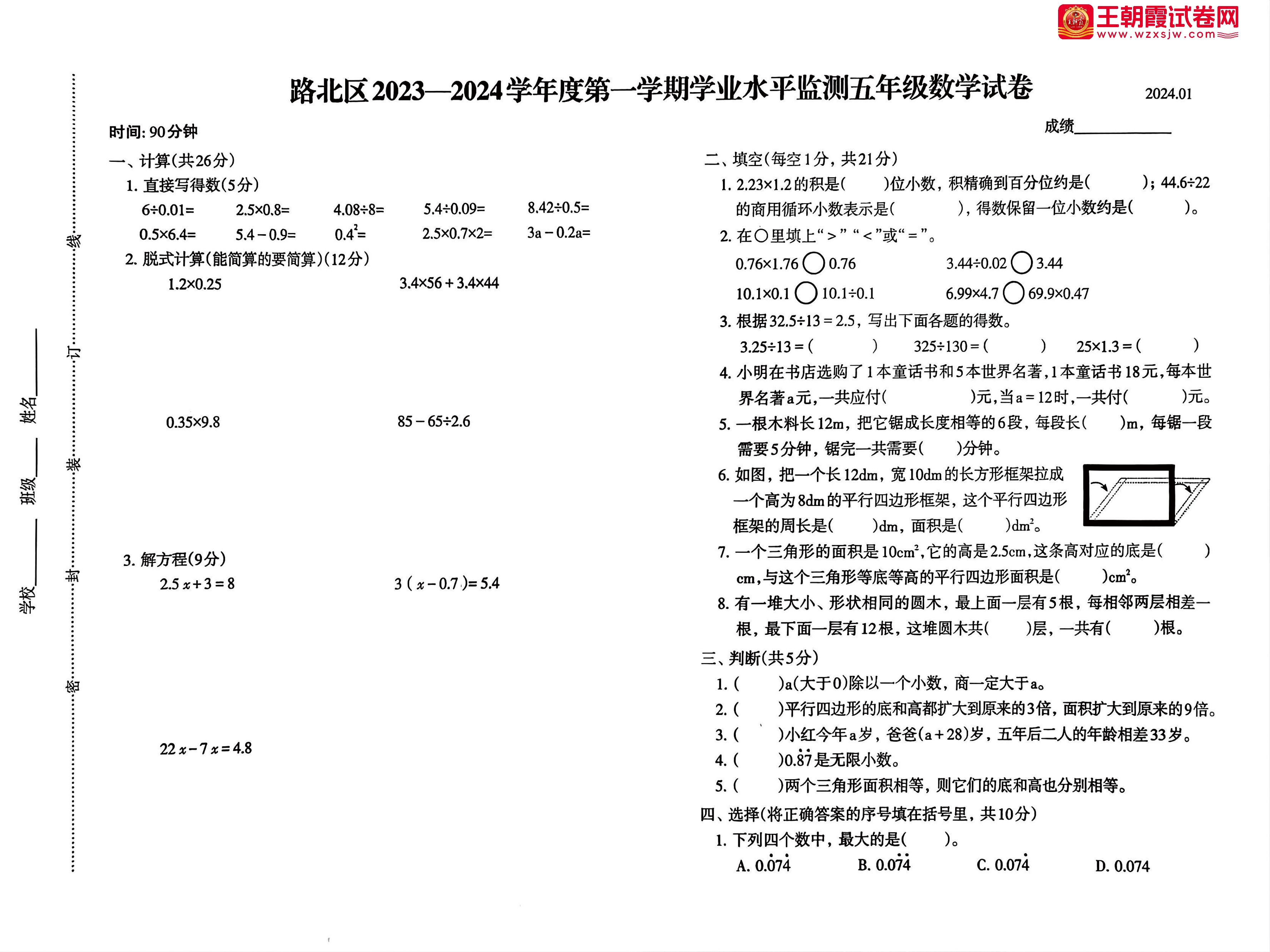 河北省唐山市路北区2023-2024学年度第一学期学业水平监测五年级数学(冀教版)