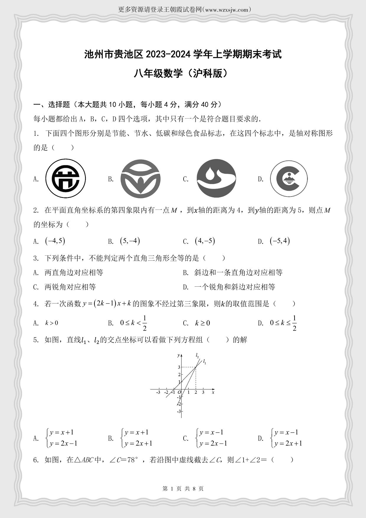 安徽省池州市贵池区2023-2024学年上学期末考试八年级数学(沪科版)