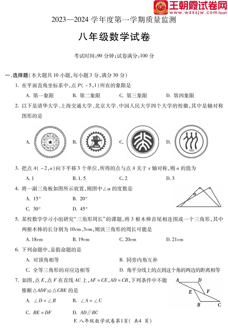 安徽省宣城市宁国市2023-2024学年度第一学期期末质量监测八年级数学(沪科版)