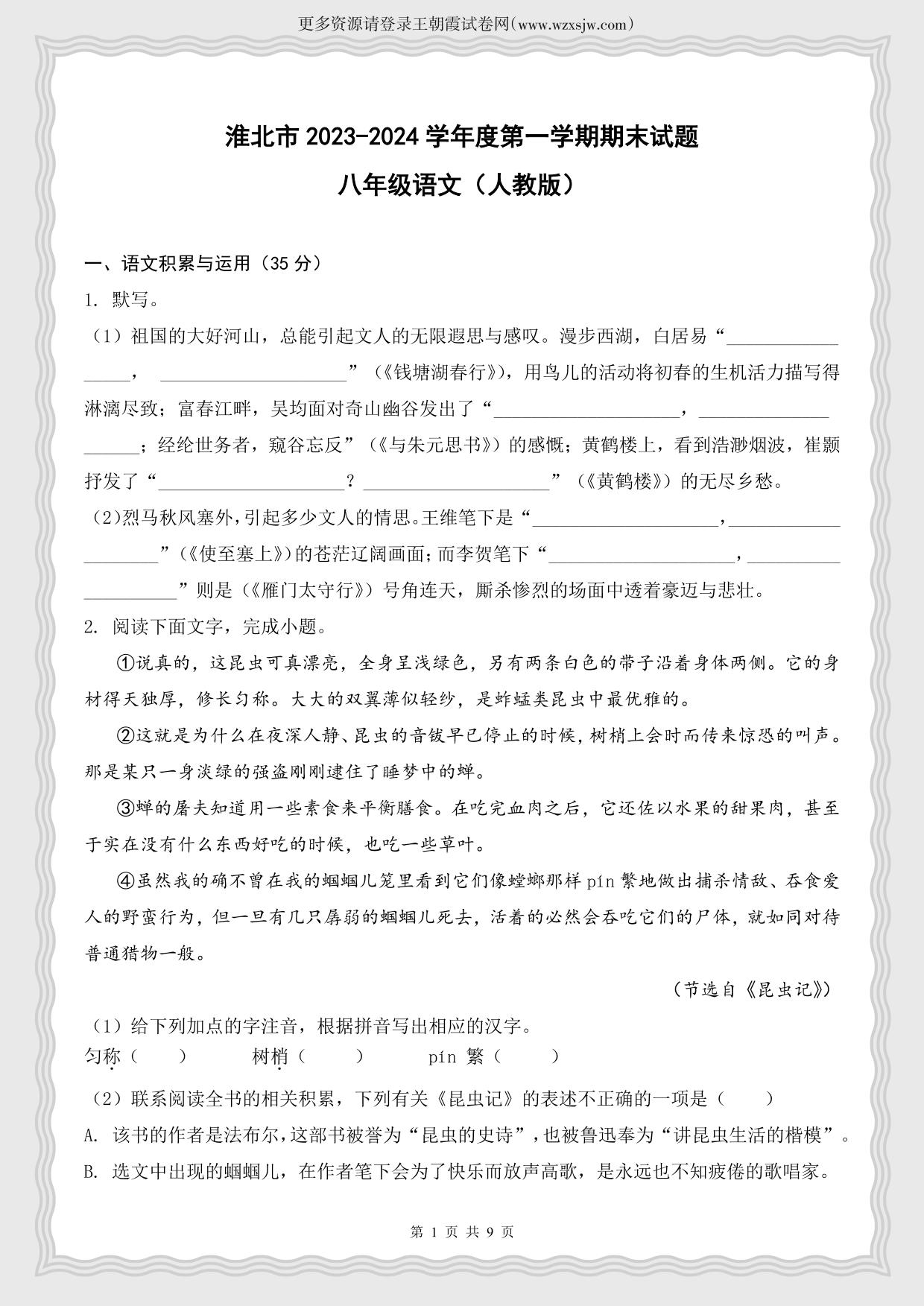 安徽省淮北市2023-2024学年度第一学期期末试题八年级语文(人教版)