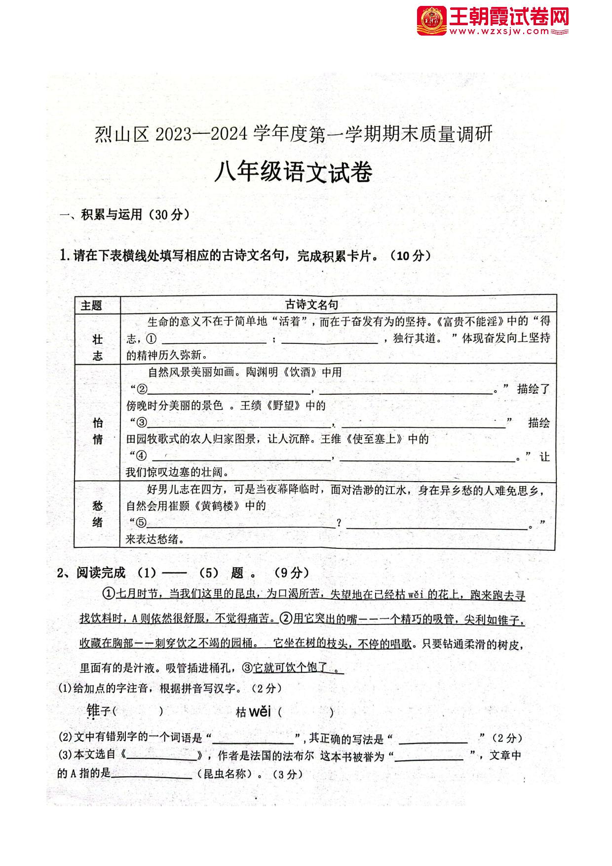 安徽省淮北市烈山区2023-2024学年度第一学期期末质量调研八年级语文(人教版)
