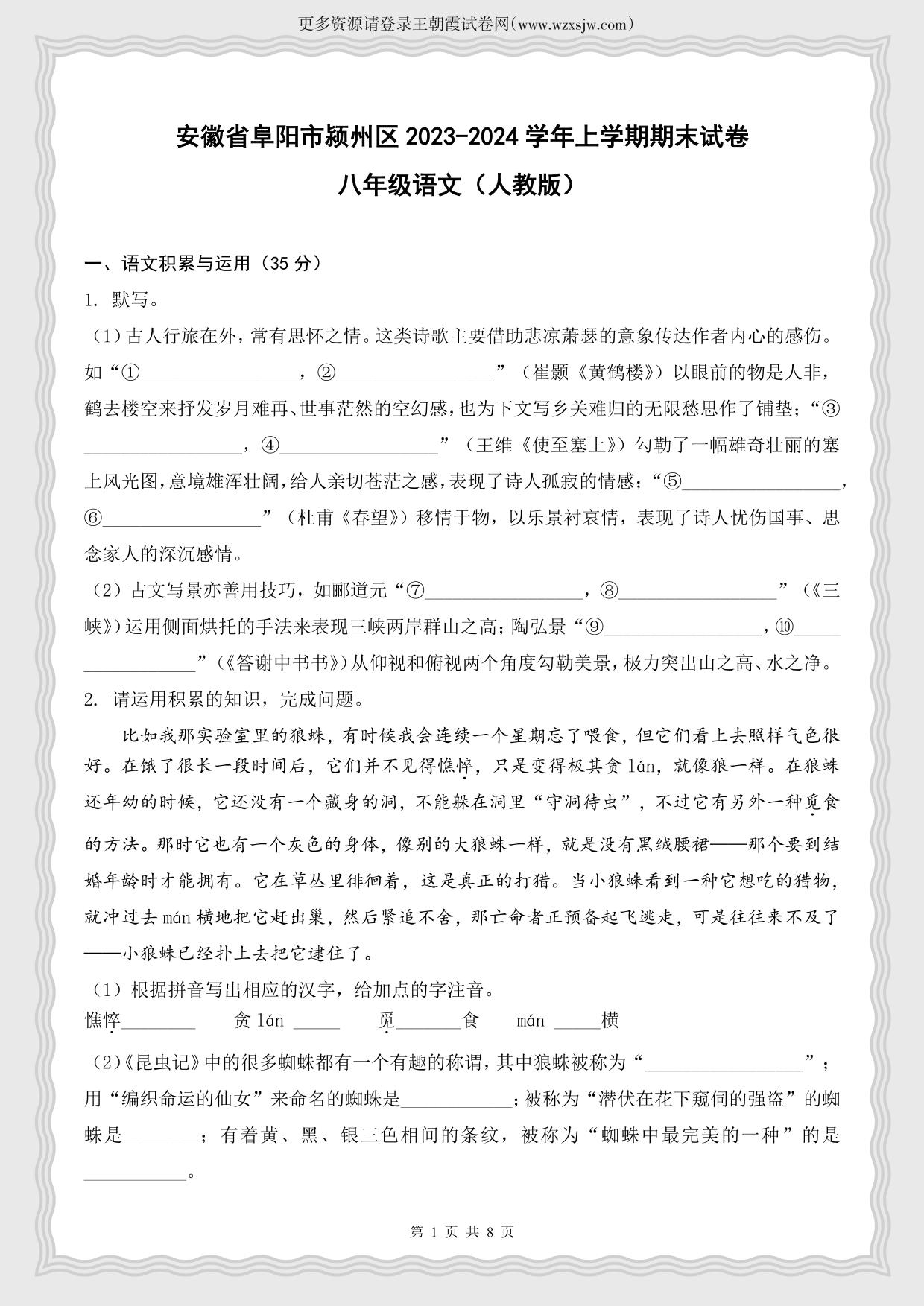 安徽省阜阳市颍州区2023-2024学年上学期期末试卷八年级语文(人教版)