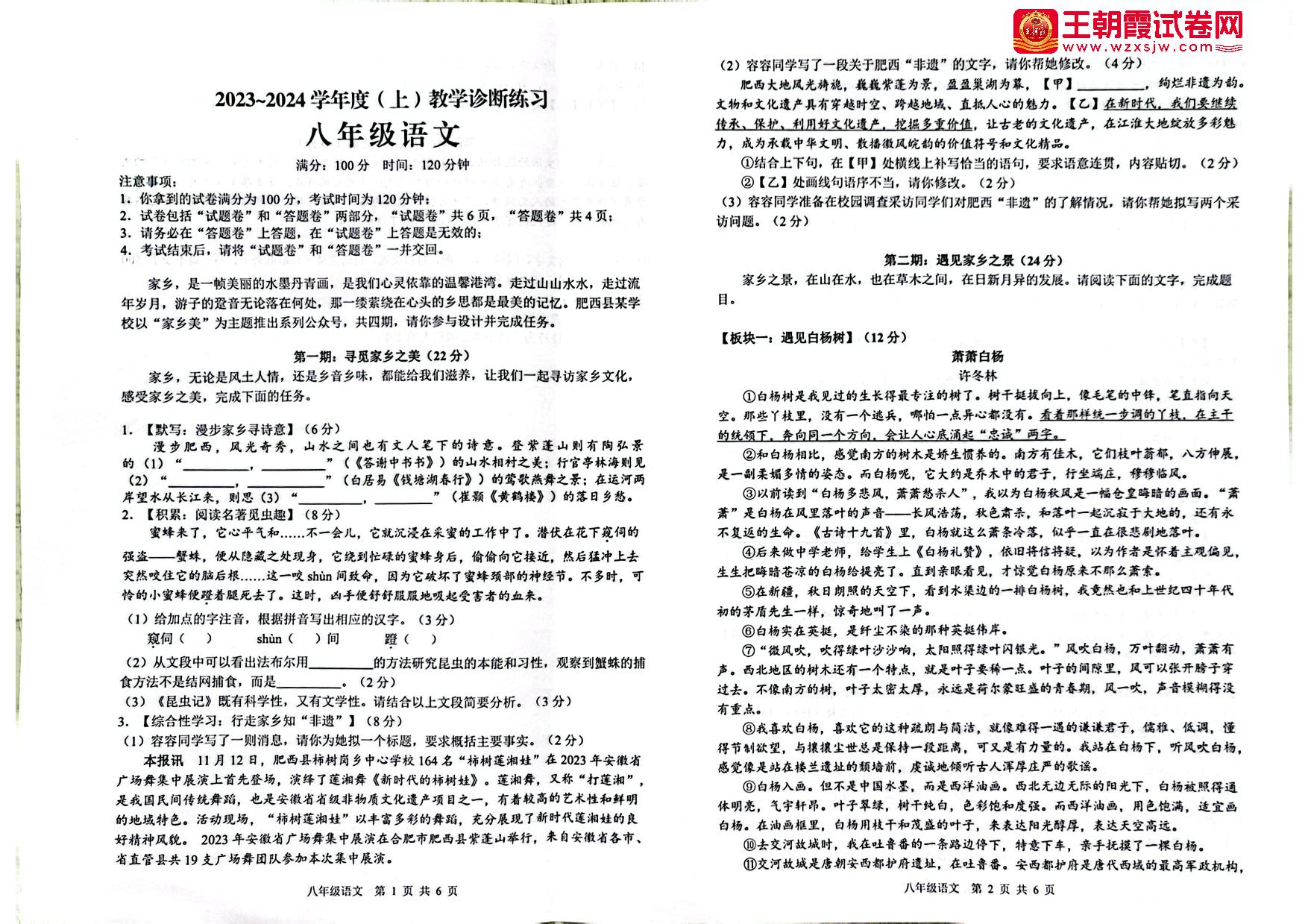 安徽省合肥市肥西县2023-2024学年度上学期末教学诊断练习八年级语文(人教版)