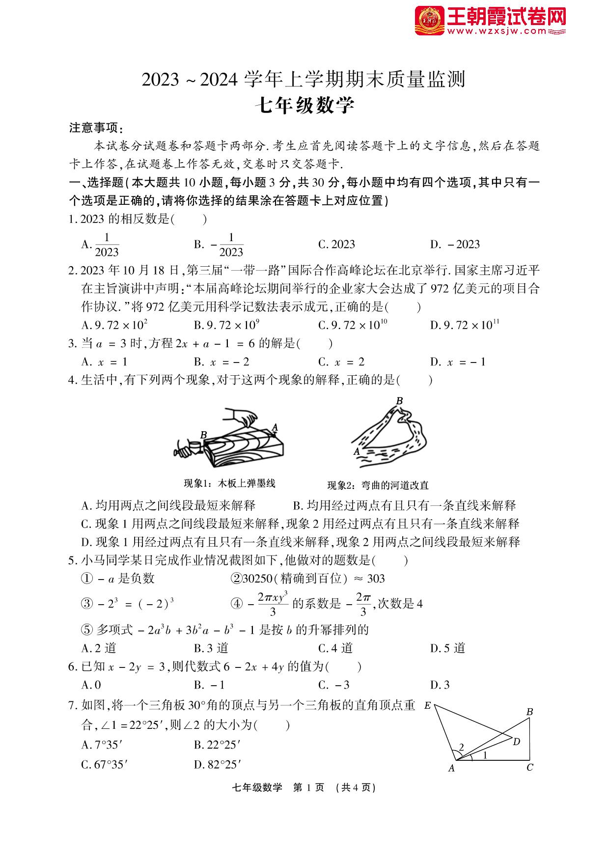 河南省许昌市长葛市2023-2024学年上学期期末质量监测七年级数学(人教版)
