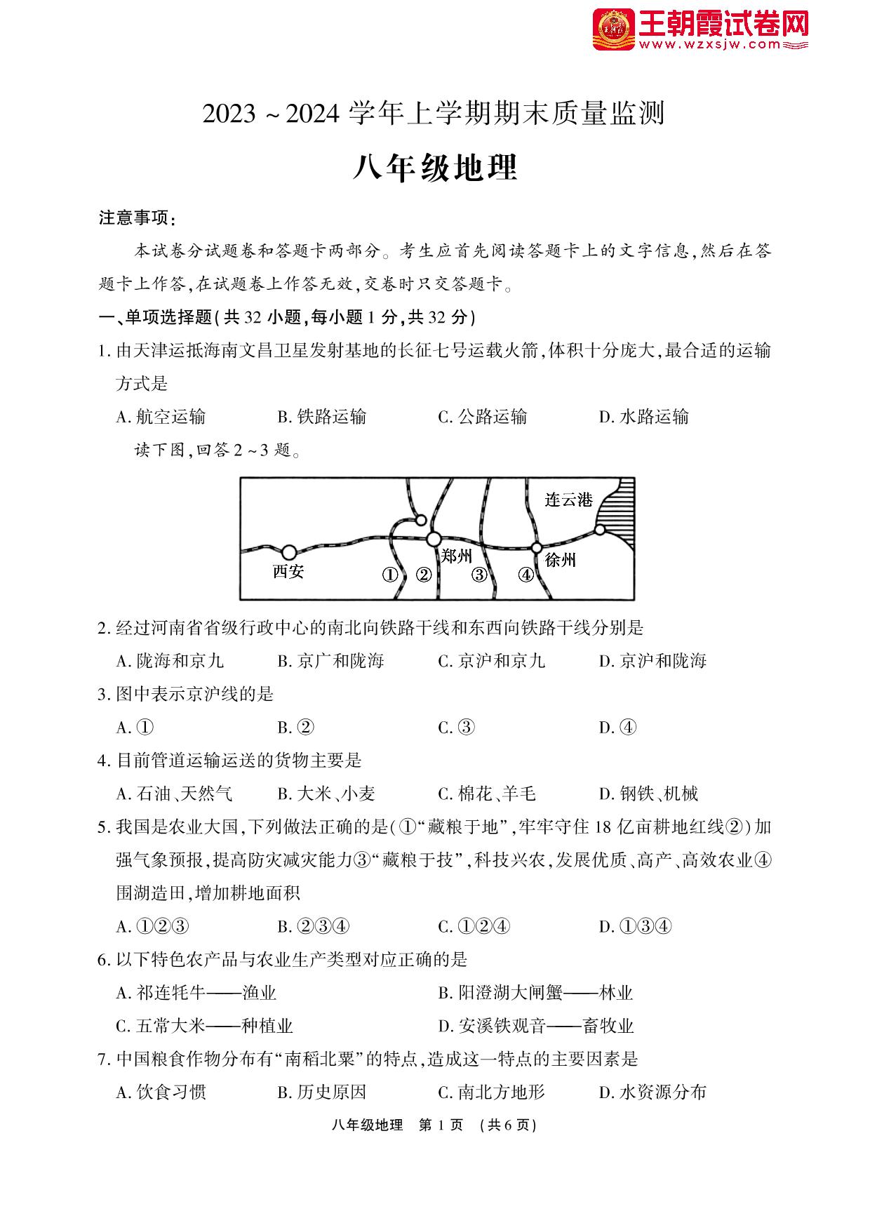 河南省许昌市长葛市2023-2024学年上学期期末质量监测八年级地理(人教版)
