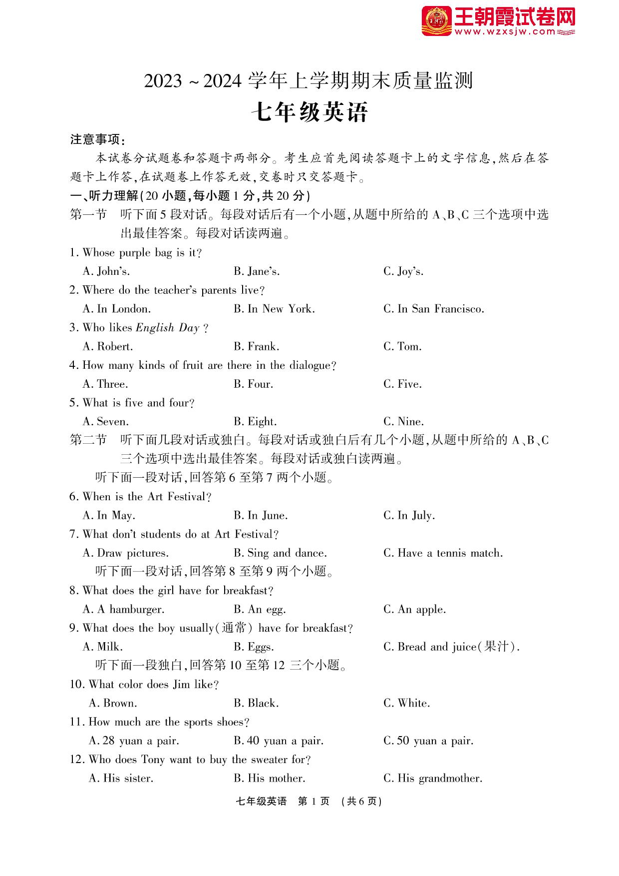 七年级英语人教版上册期末卷