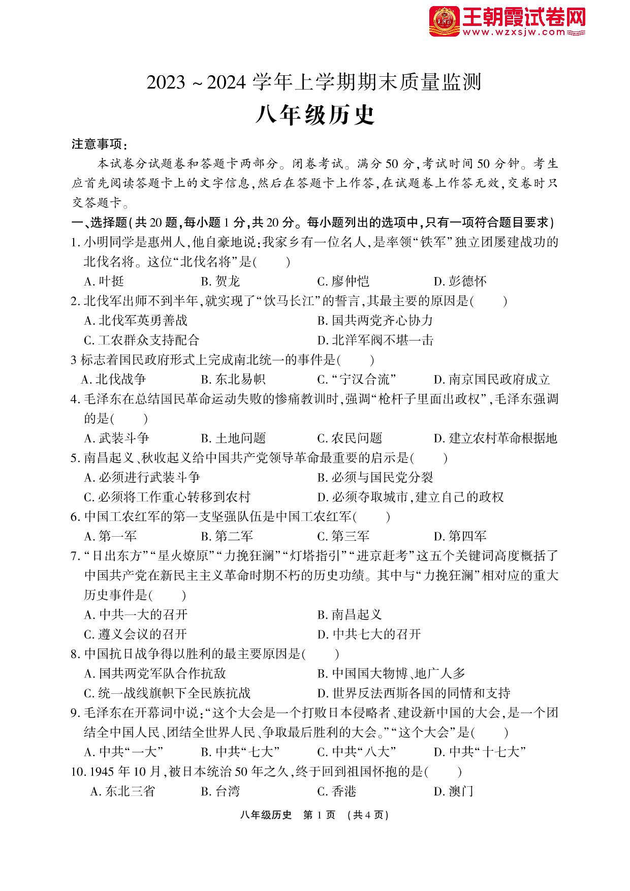 河南省许昌市长葛市2023-2024学年上学期期末质量监测八年级历史(人教版)