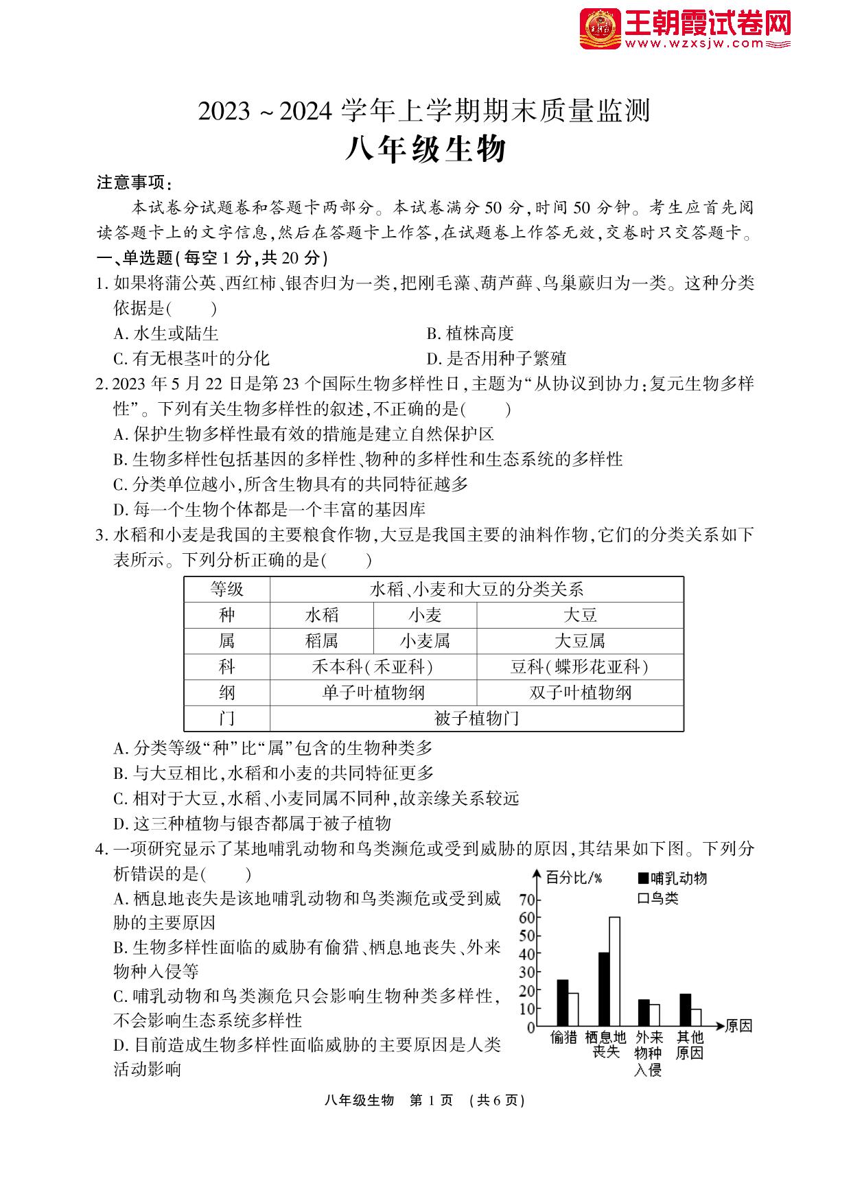 河南省许昌市长葛市2023-2024学年上学期期末质量监测八年级生物(人教版)