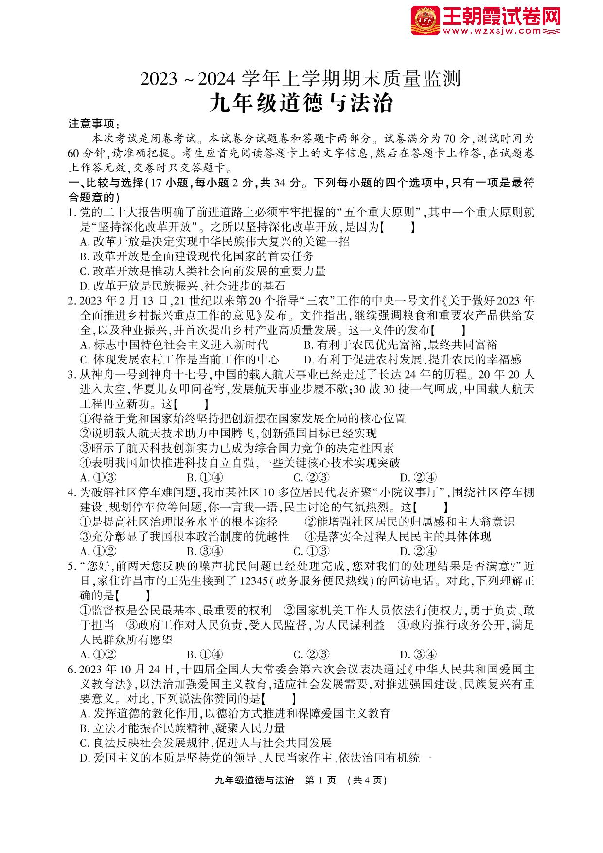 河南省许昌市长葛市2023-2024学年上学期期末质量监测九年级道德与法治(人教版)