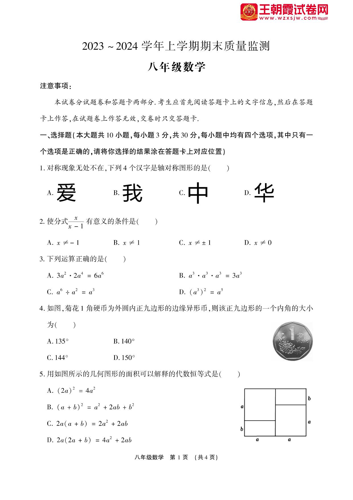 河南省许昌市长葛市2023-2024学年上学期期末质量监测八年级数学(人教版)