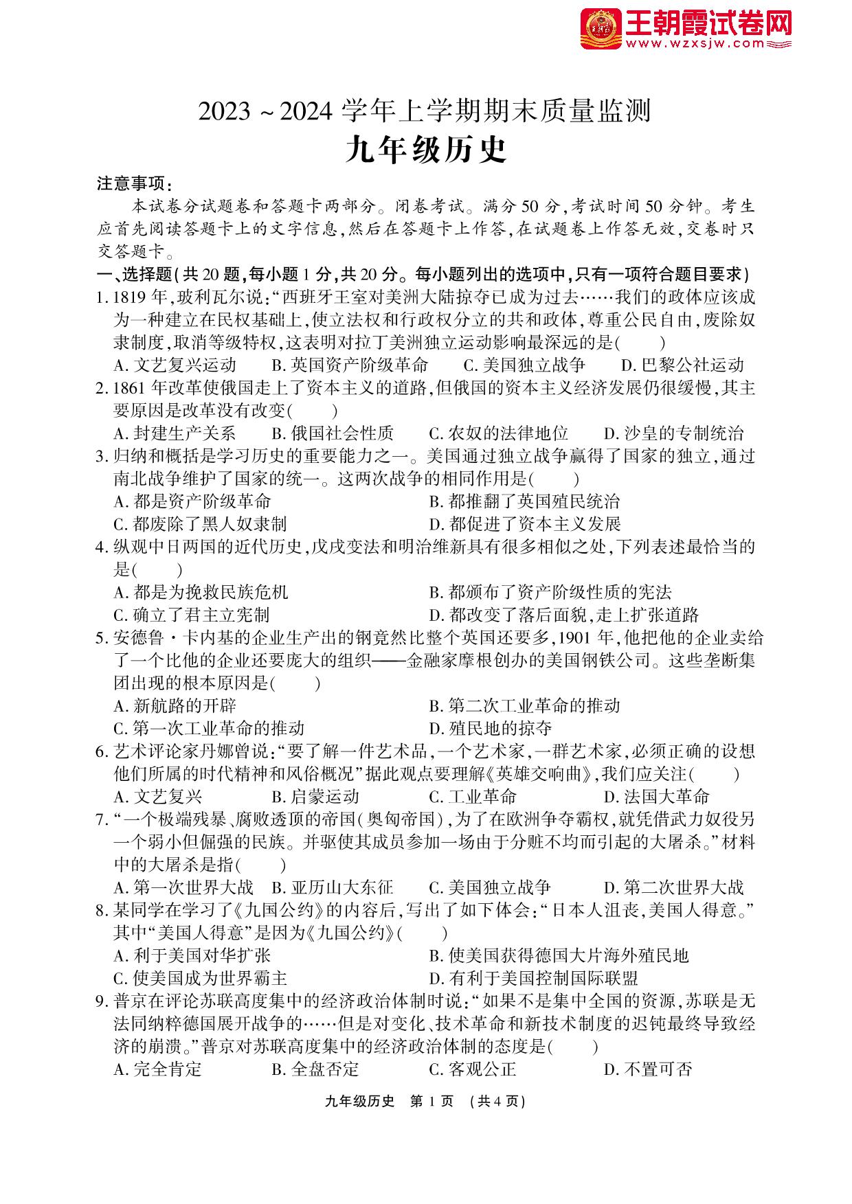 河南省许昌市长葛市2023-2024学年上学期期末质量监测九年级历史(人教版)