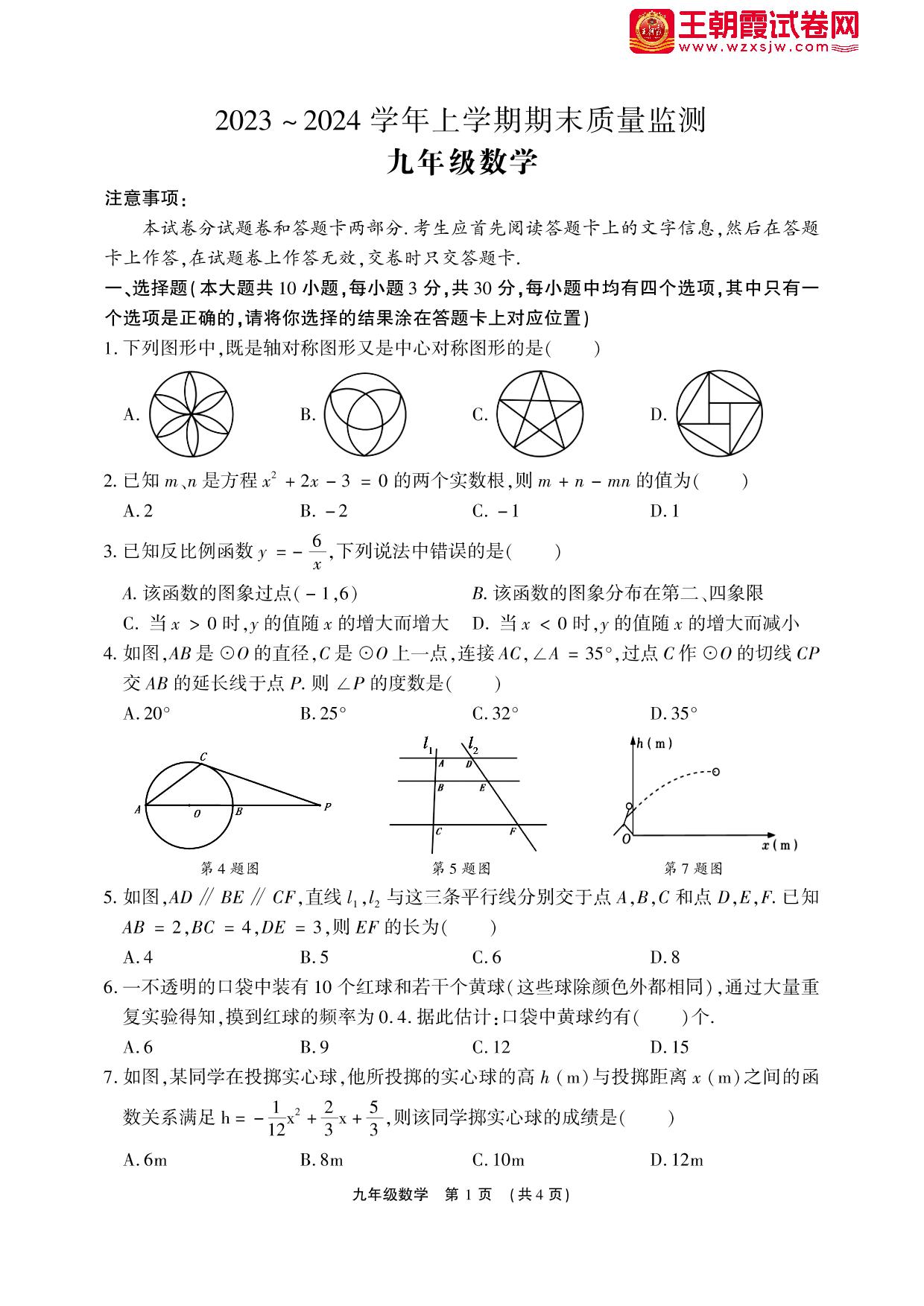 河南省许昌市长葛市2023-2024学年上学期期末质量监测九年级数学(人教版)