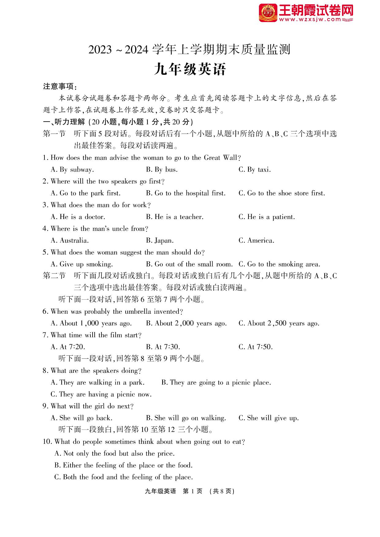 九年级英语人教版上册期末卷
