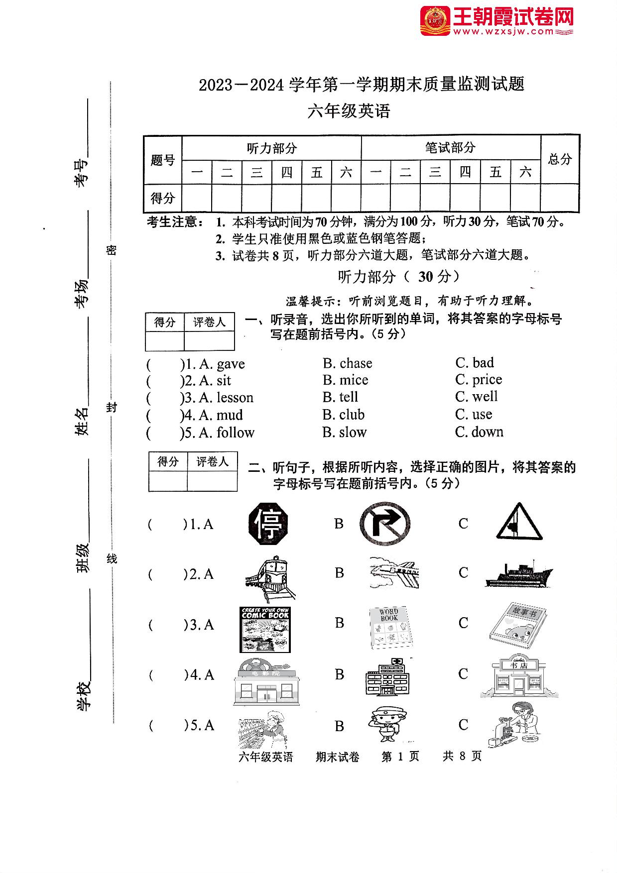 河北省承德市兴隆县2023-2024学年第一学期期末质量监测试题六年级英语(人教PEP版)