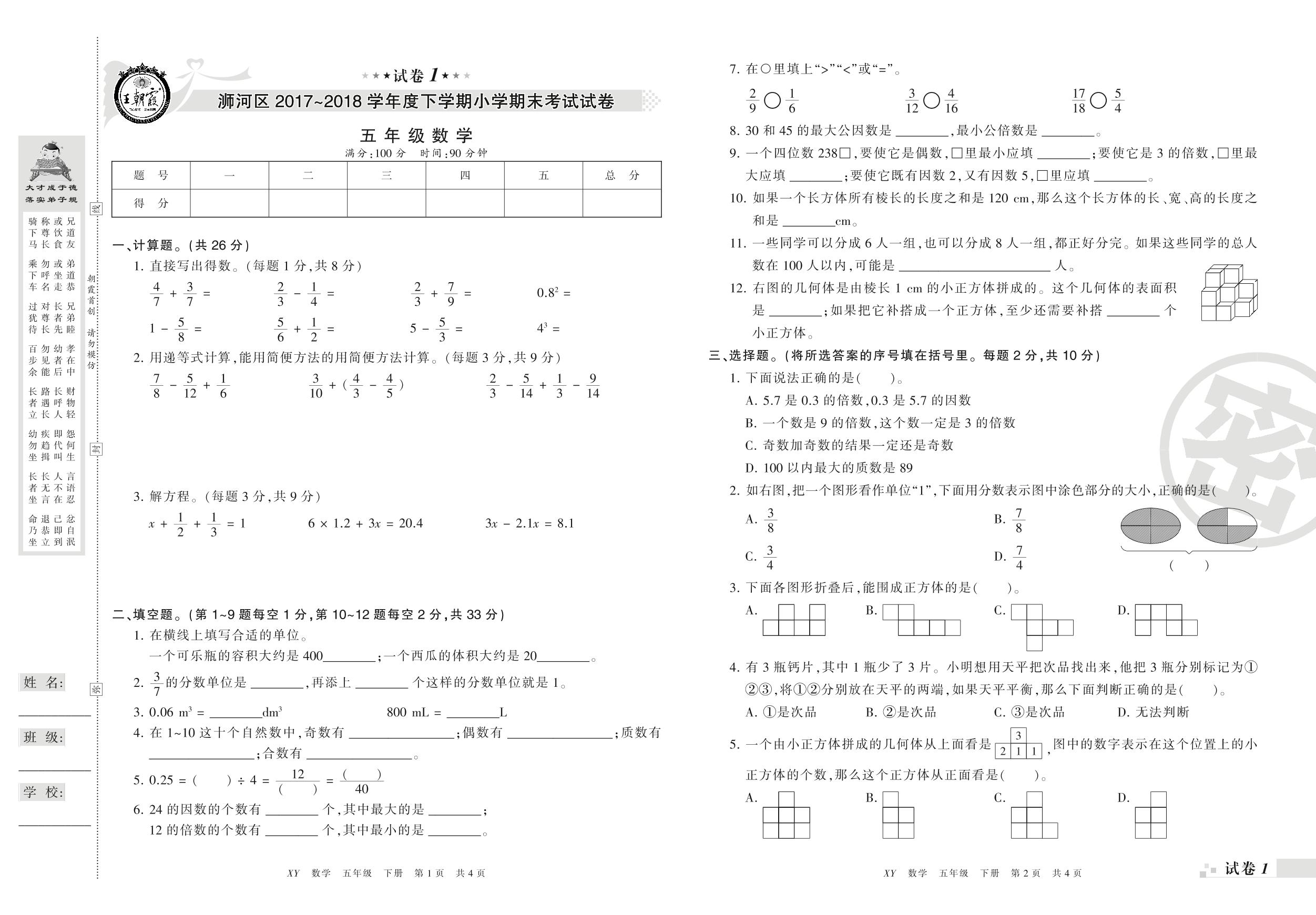 2017-2018学年第二学期信阳市浉河区五年级数学试卷(人教版)【1】