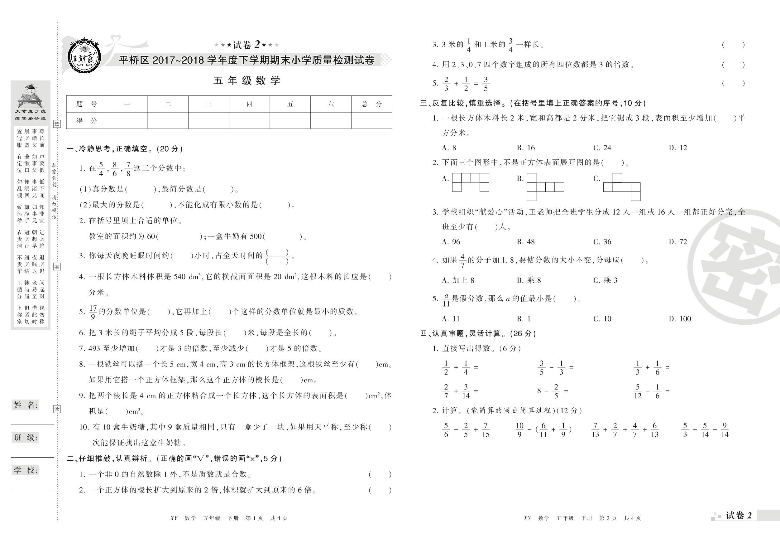 2017-2018学年第二学期信阳市平桥区五年级数学试卷(人教版)【2】