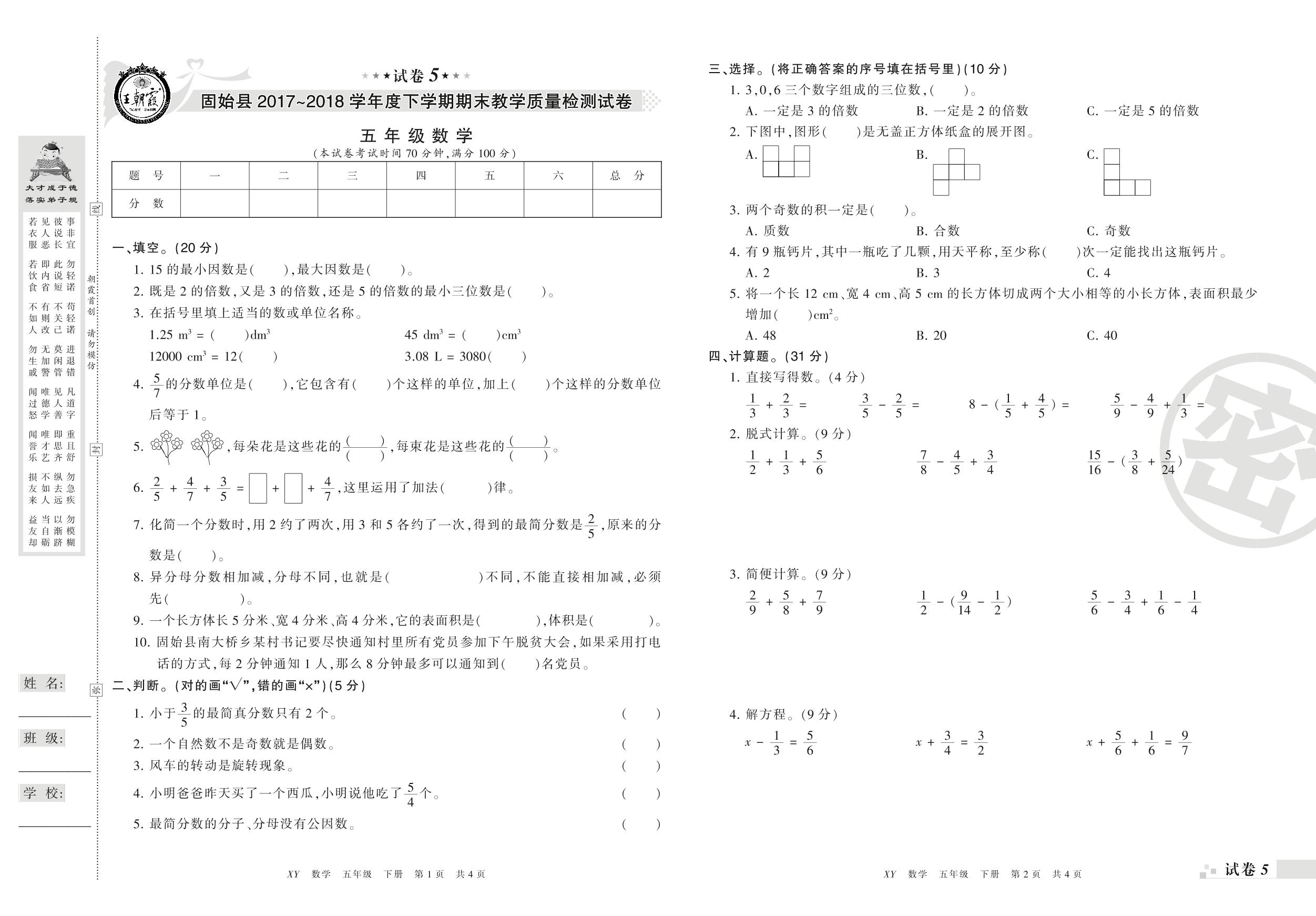 2017-2018学年第二学期信阳市固始县五年级数学试卷(人教版)【5】