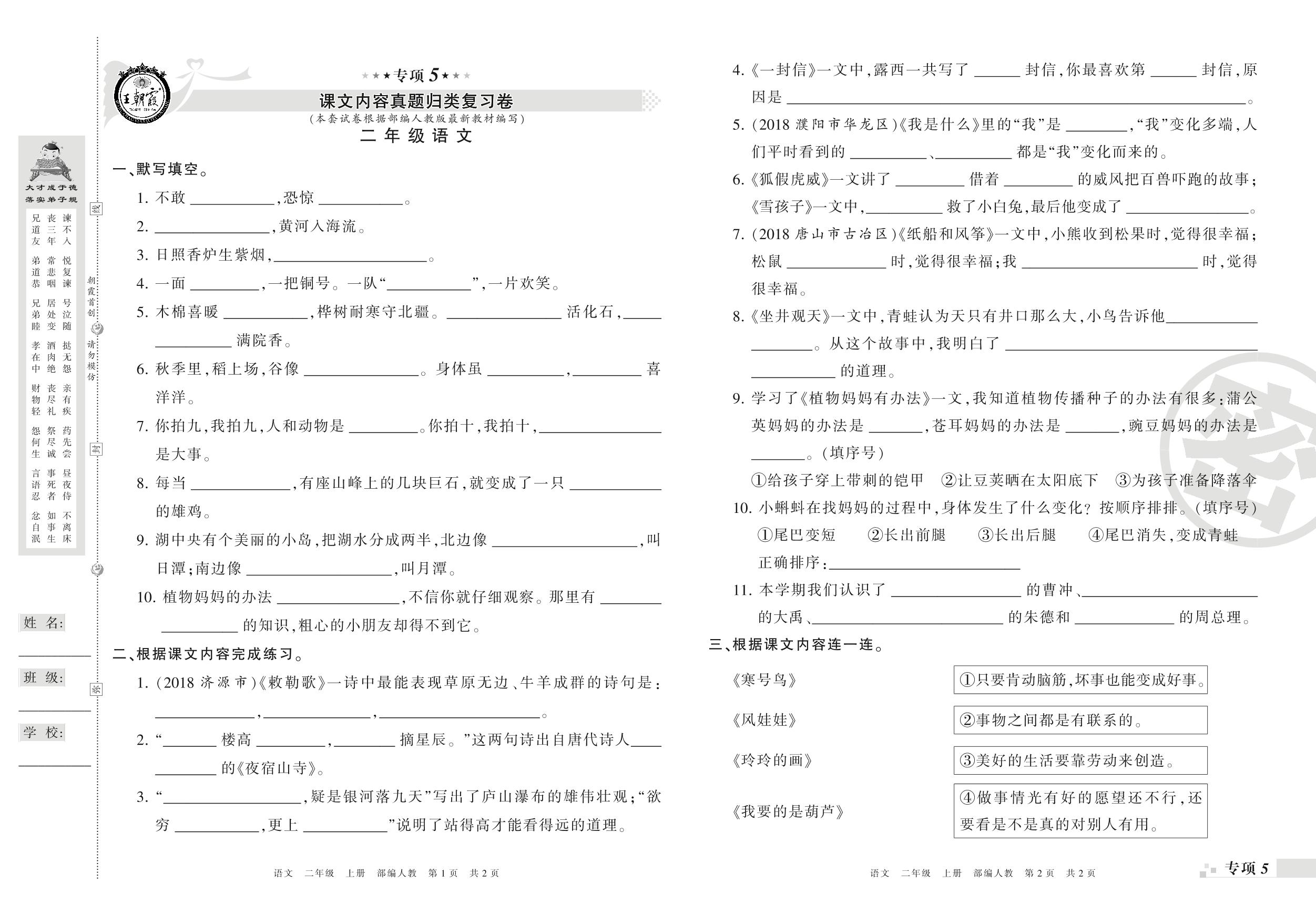 王朝霞期末专项卷——课文内容、积累运用真题归类复习卷二年级上册语文(人教版)_R21080171204【0】