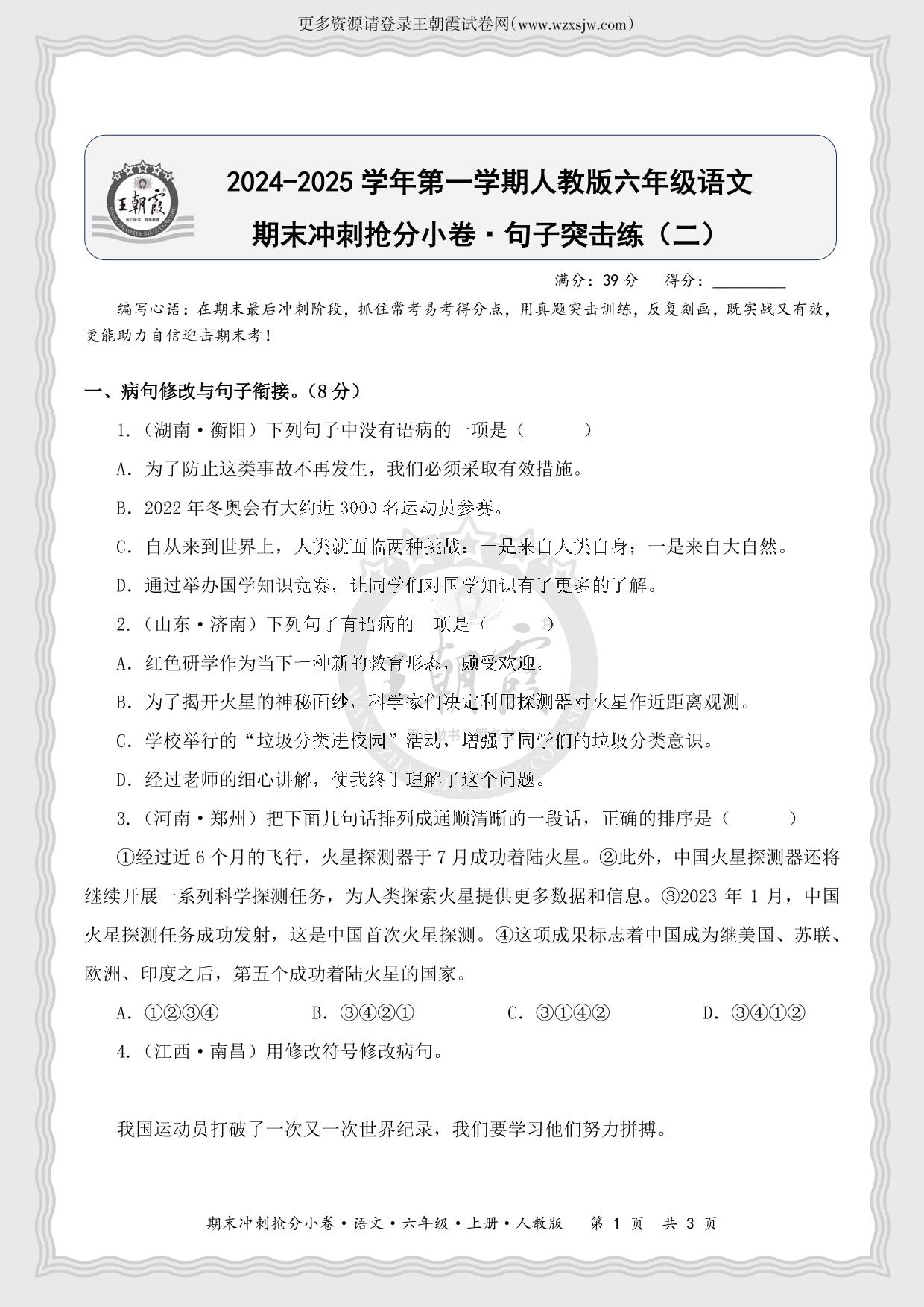 2024-2025学年第一学期六年级语文期末冲刺抢分小卷·句子突击练(二)(人教版)