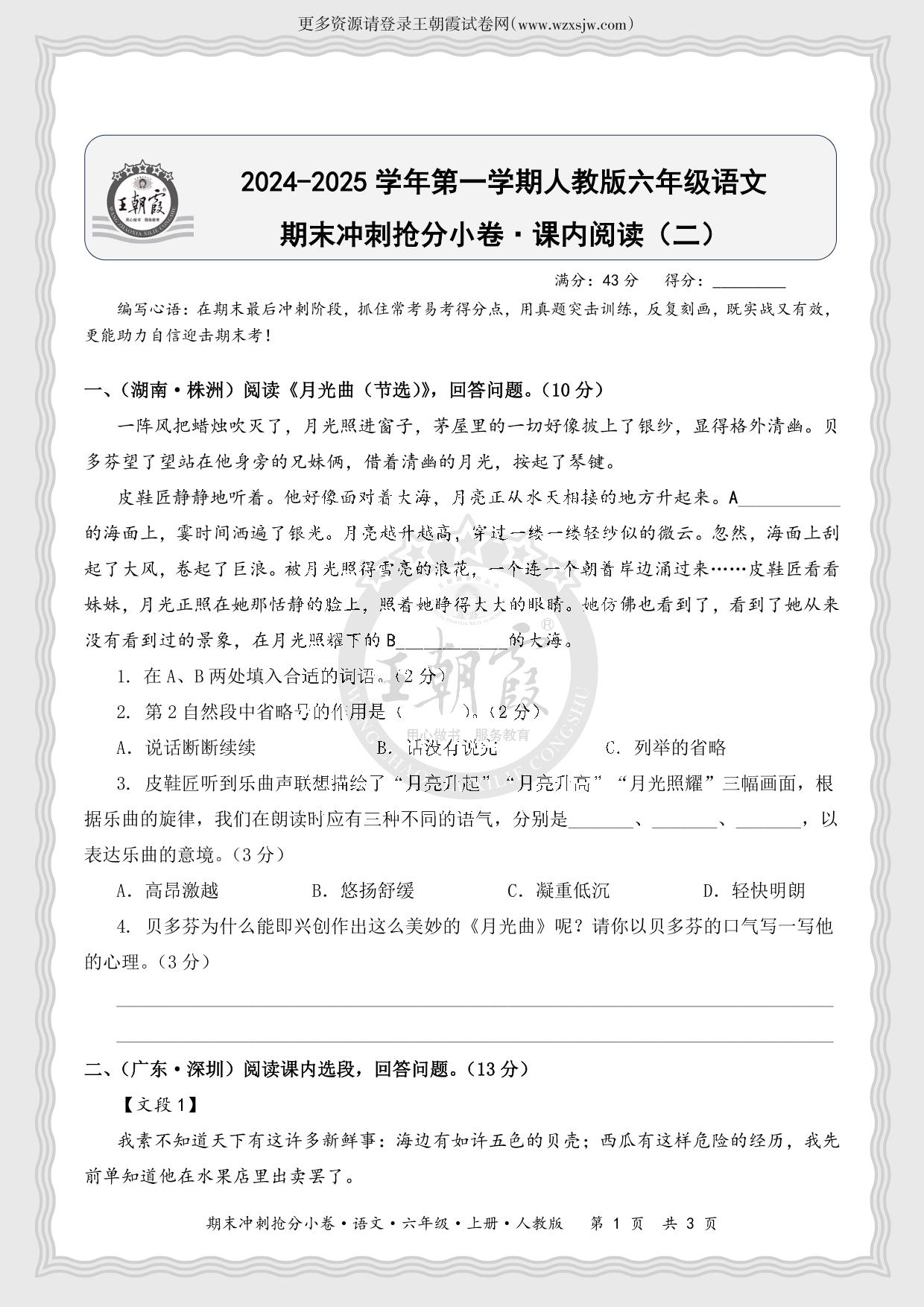 2024-2025学年第一学期六年级语文期末冲刺抢分小卷·课内阅读(二)(人教版)