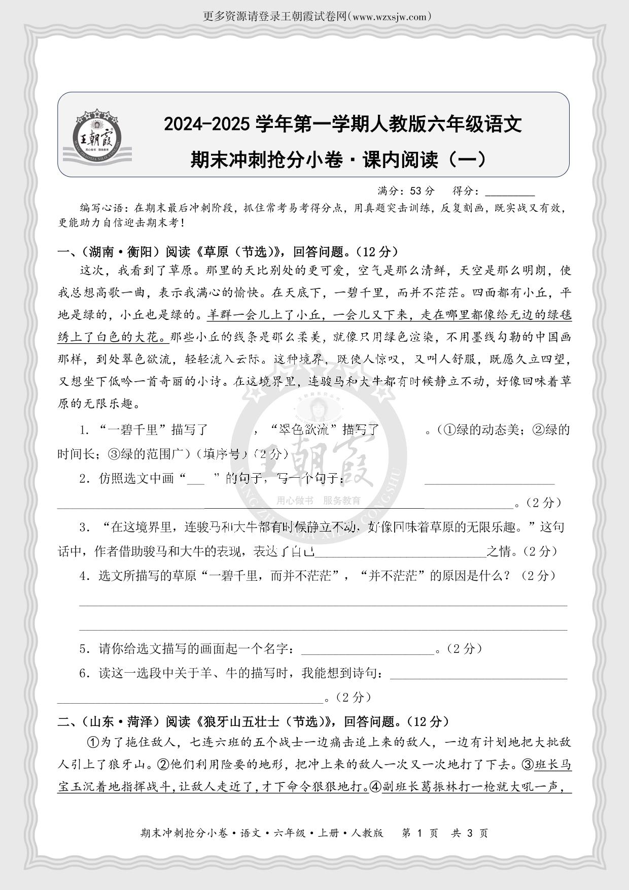 2024-2025学年第一学期六年级语文期末冲刺抢分小卷·课内阅读(一)(人教版)
