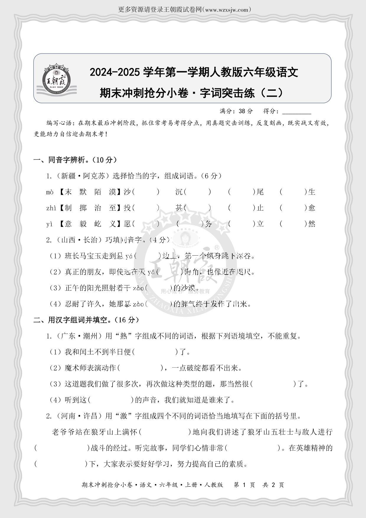 2024-2025学年第一学期六年级语文期末冲刺抢分小卷·字词突击练(二)(人教版)
