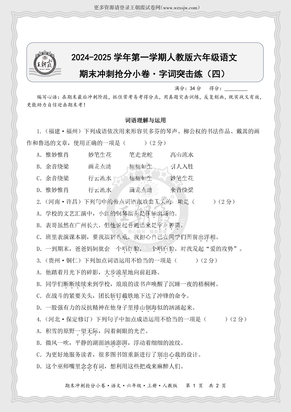 2024-2025学年第一学期六年级语文期末冲刺抢分小卷·字词突击练(四)(人教版)