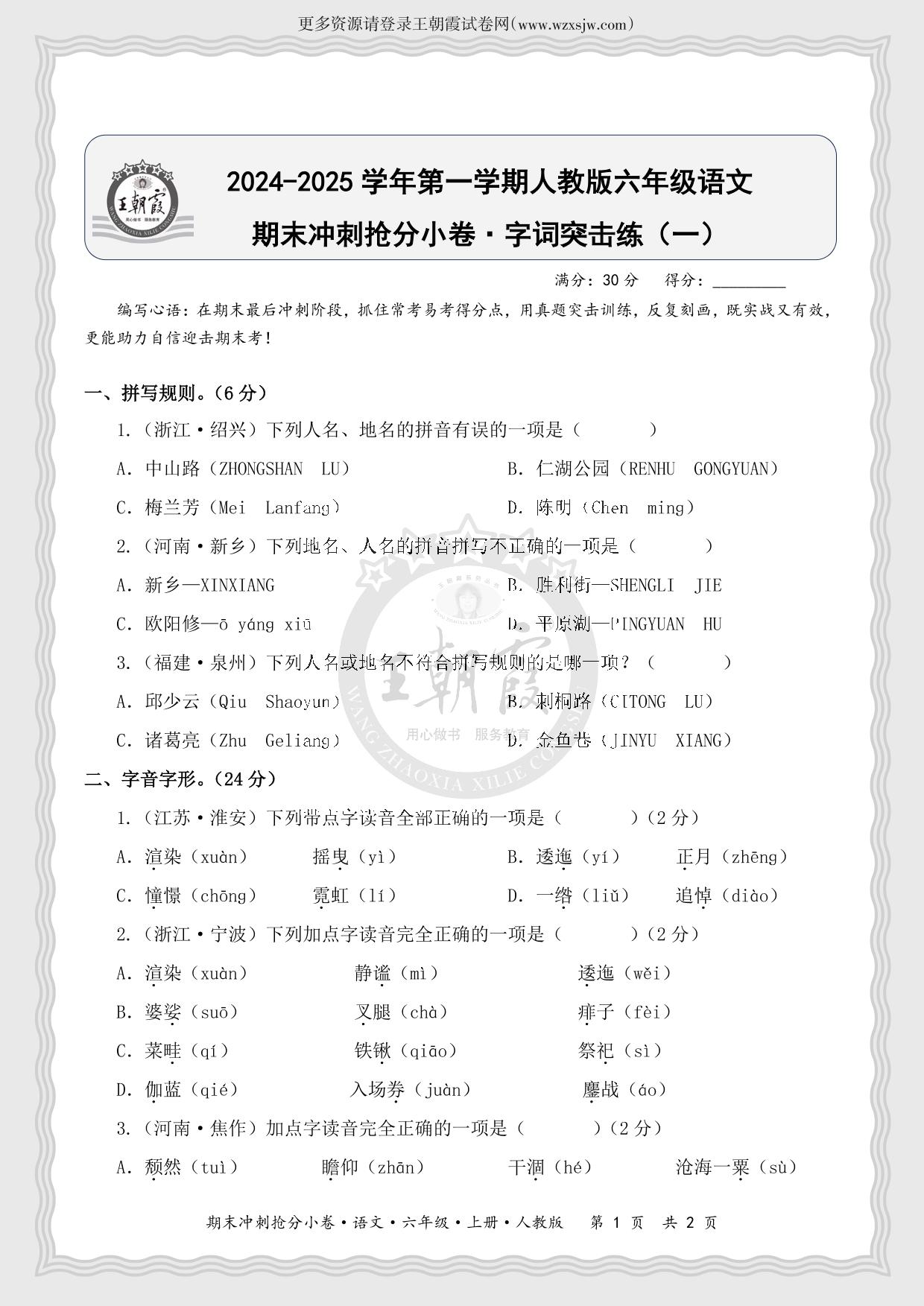 2024-2025学年第一学期六年级语文期末冲刺抢分小卷·字词突击练(一)(人教版)