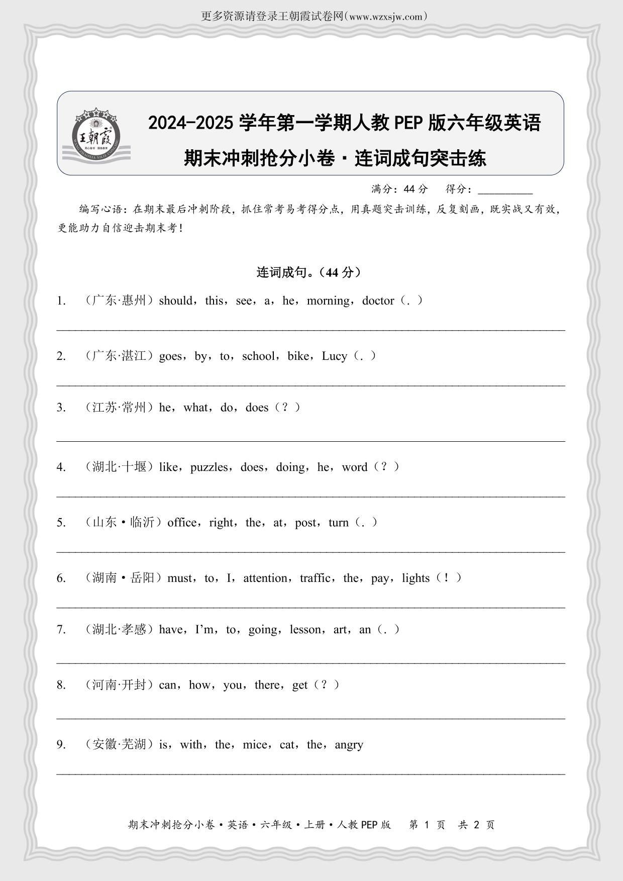 2024-2025学年第一学期六年级英语期末冲刺抢分小卷·连词成句突击练(人教PEP版)