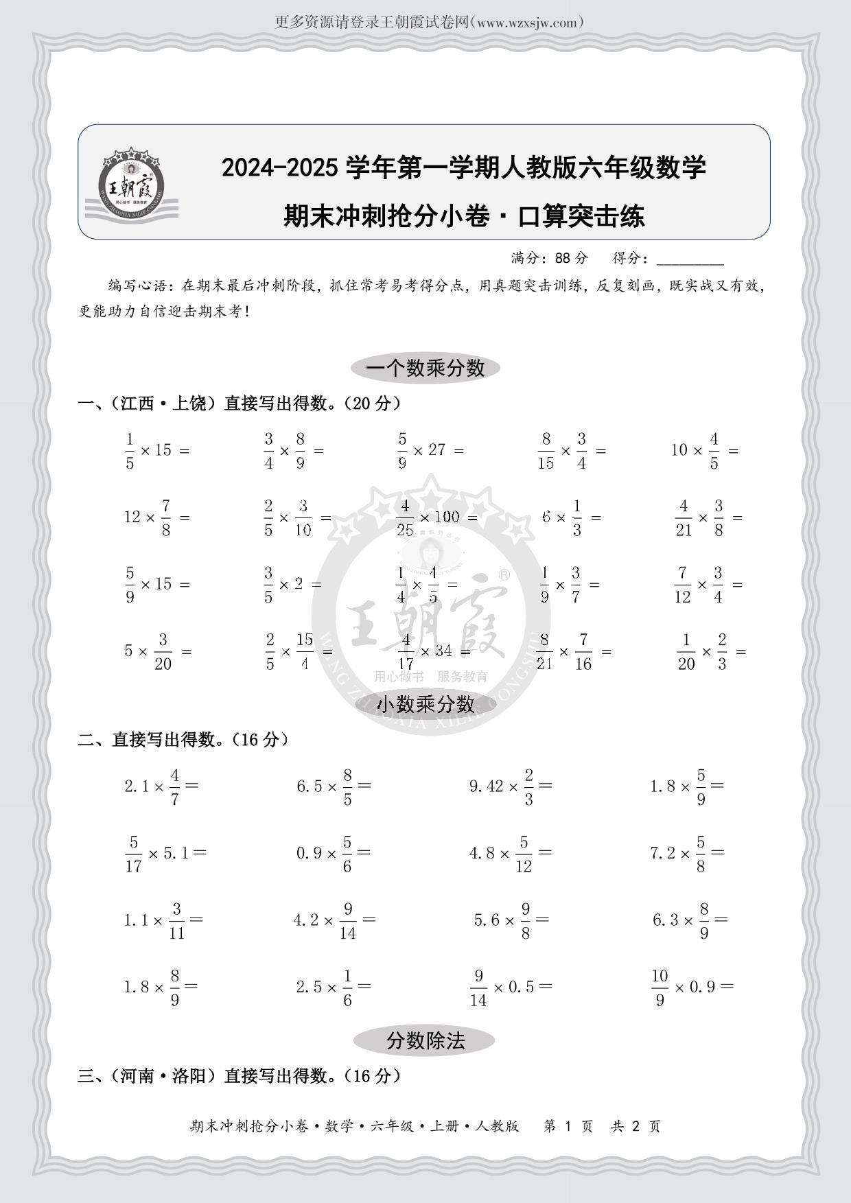 2024-2025学年第一学期六年级数学期末冲刺抢分小卷·口算突击练(人教版)