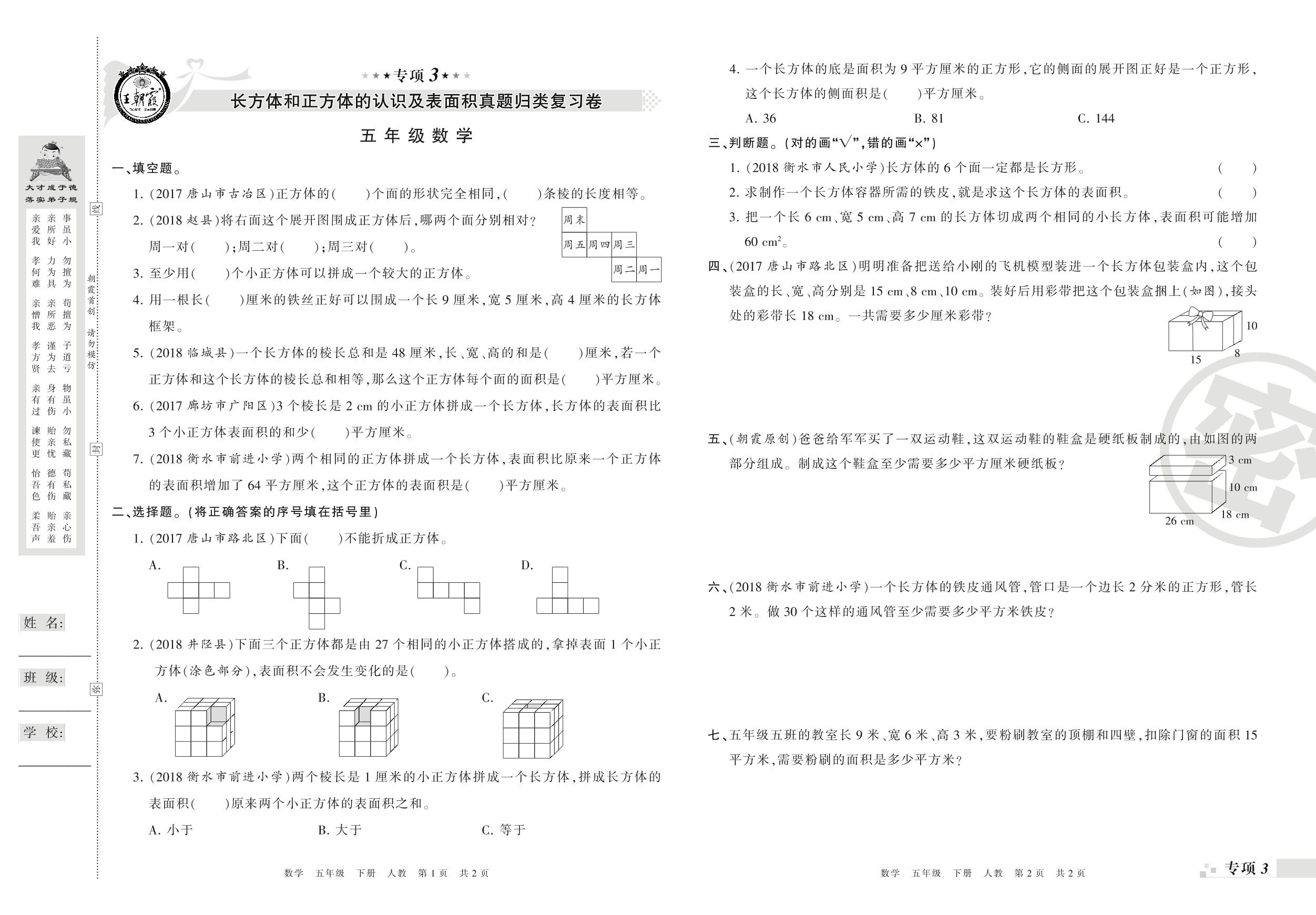 王朝霞期末专项卷——长方体和正方体的认识及表面积、长方体和正方体的体积真题归类复习卷五年级下册数学(人教版)_R210804173326【0】
