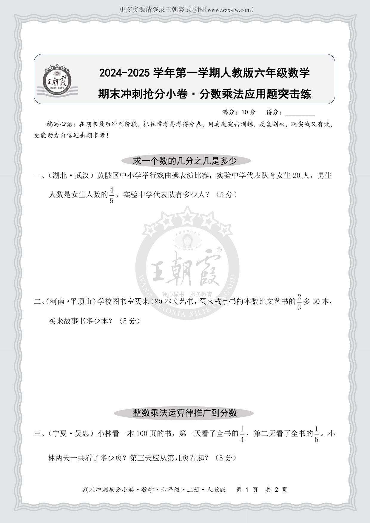 2024-2025学年第一学期六年级数学期末冲刺抢分小卷·分数乘法应用题突击练(人教版)