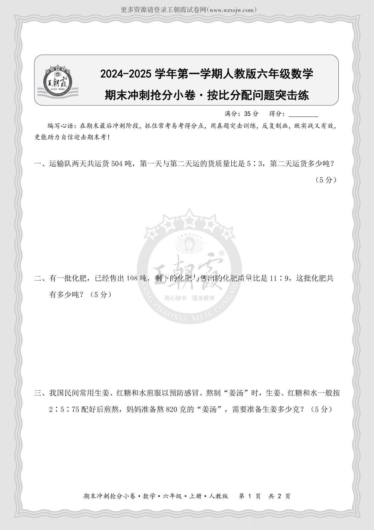 2024-2025学年第一学期六年级数学期末冲刺抢分小卷·按比分配问题突击练(人教版)