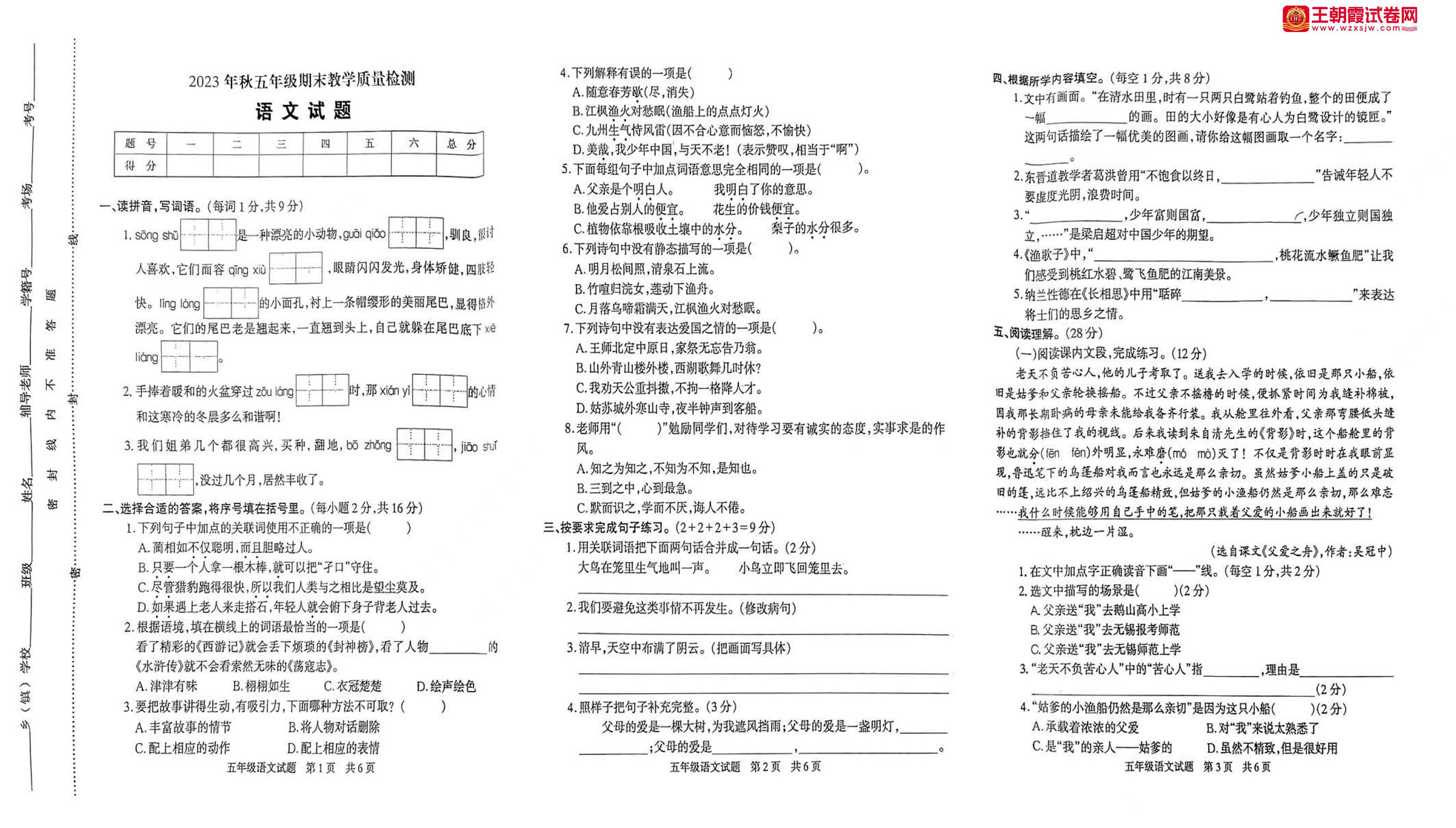 河南省驻马店市上蔡县2023-2024学年上学期期末教学质量检测五年级语文(人教版)