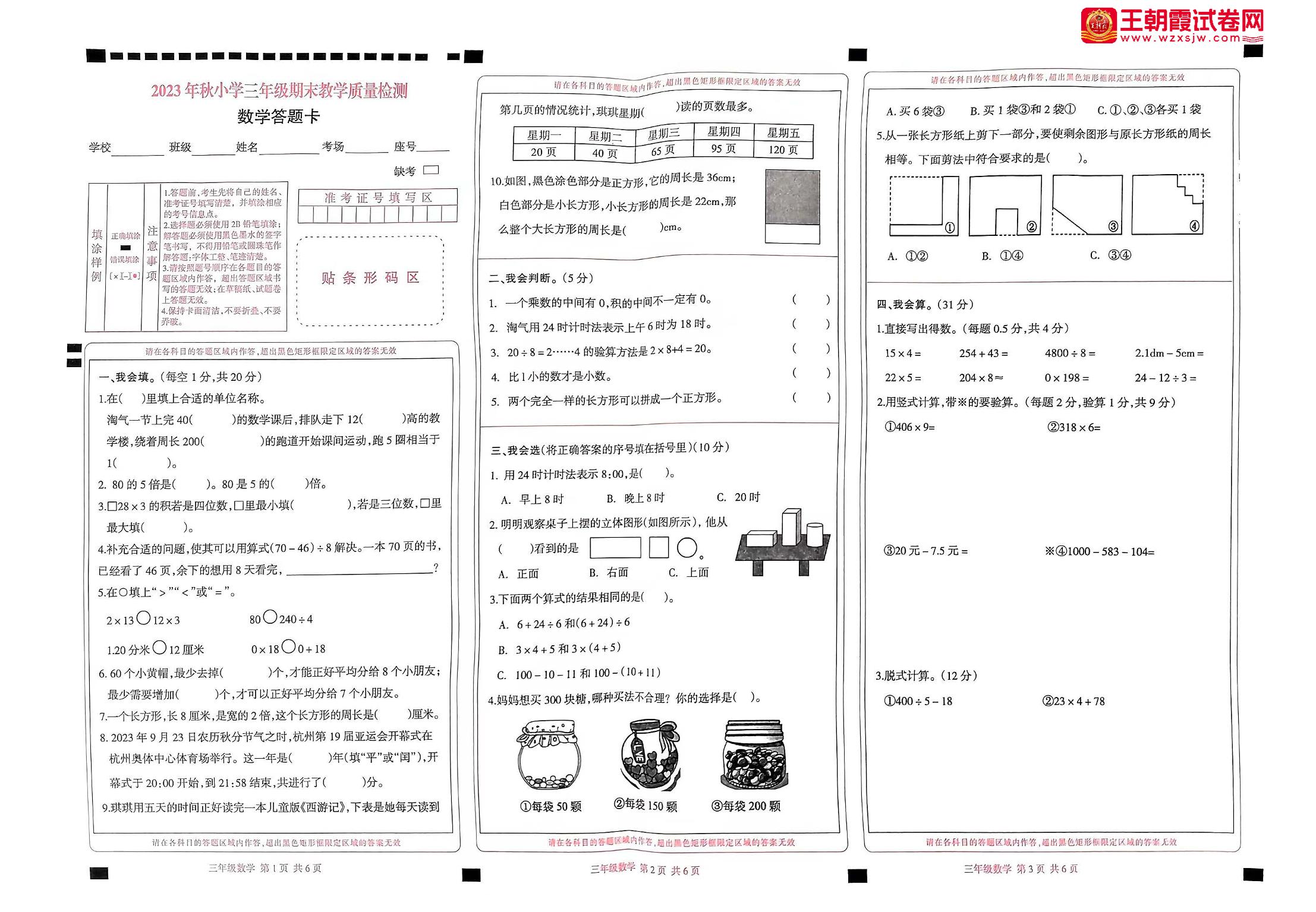 河南省驻马店市上蔡县2023-2024学年上学期期末教学质量检测三年级数学(北师版)