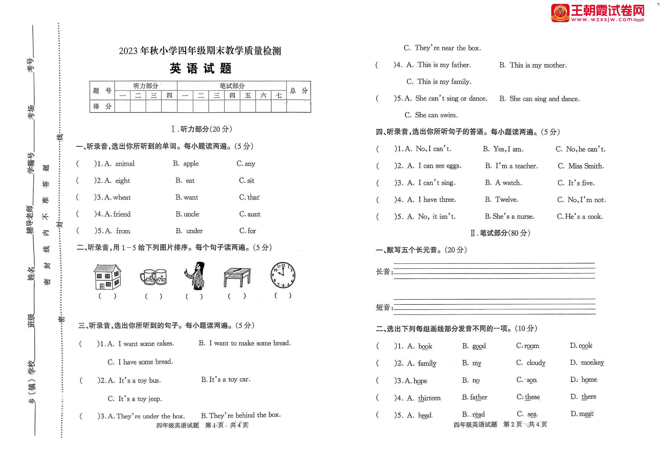 河南省驻马店市上蔡县2023-2024学年上学期期末教学质量检测四年级英语(科普版·三起始)【无听力音频】