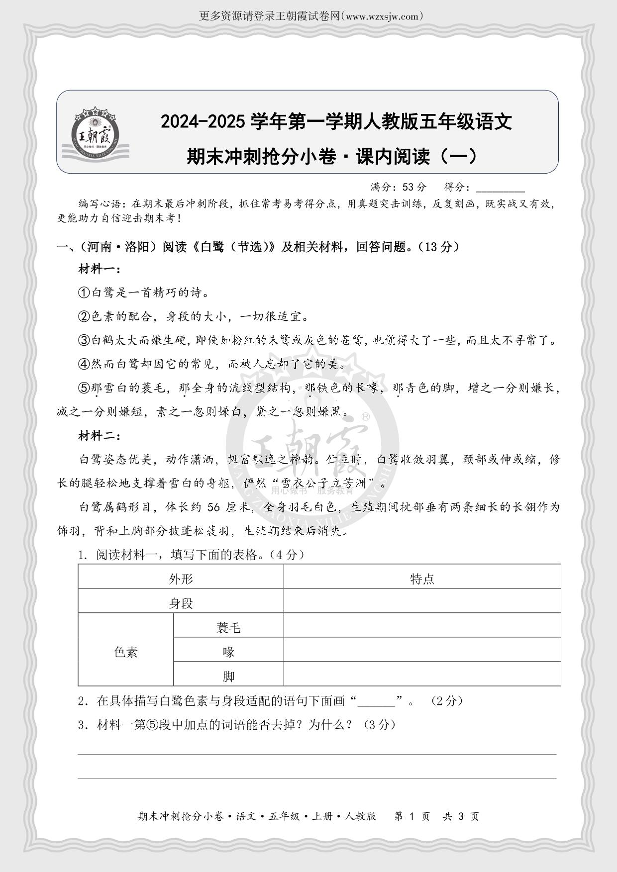 2024-2025学年第一学期五年级语文期末冲刺抢分小卷·课内阅读(一)(人教版)