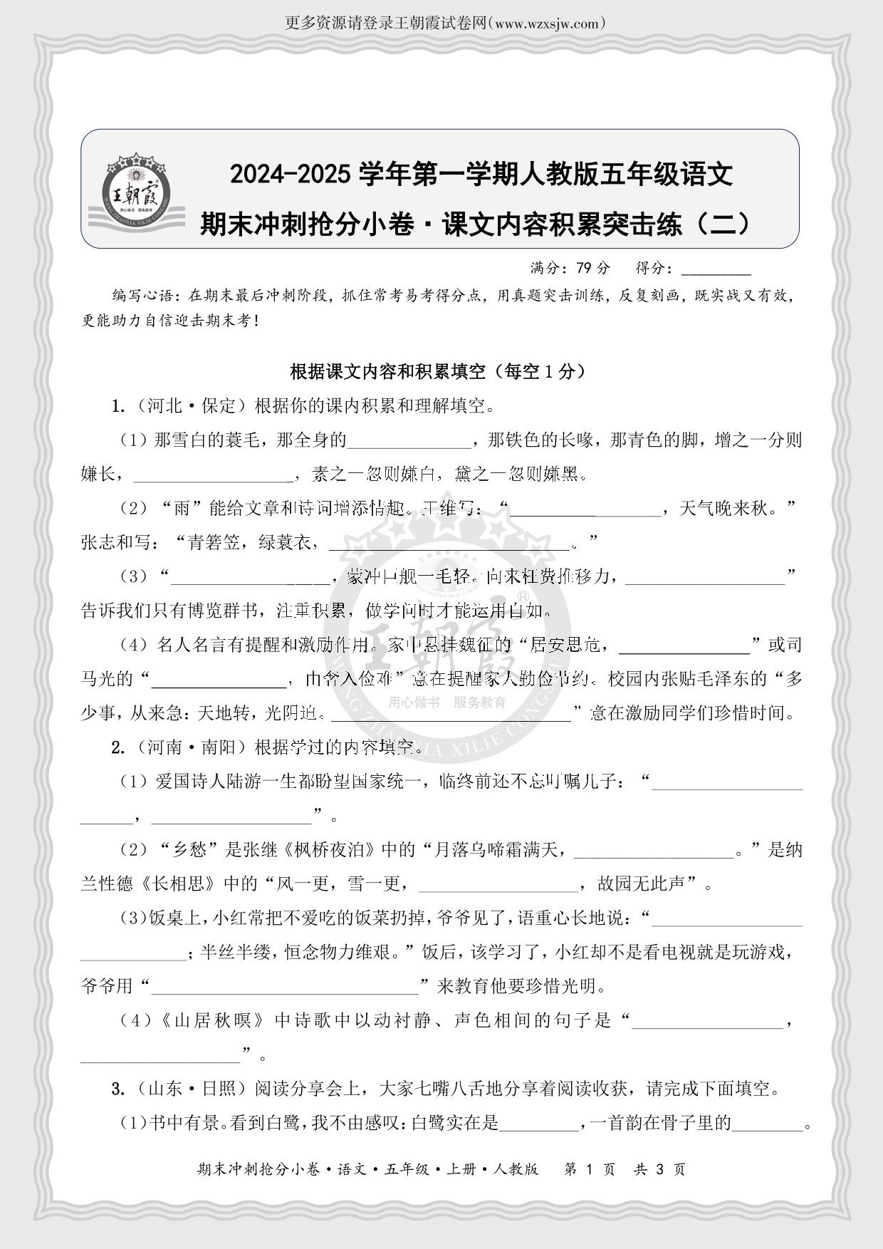 2024-2025学年第一学期五年级语文期末冲刺抢分小卷·课文内容积累突击练(二)(人教版)