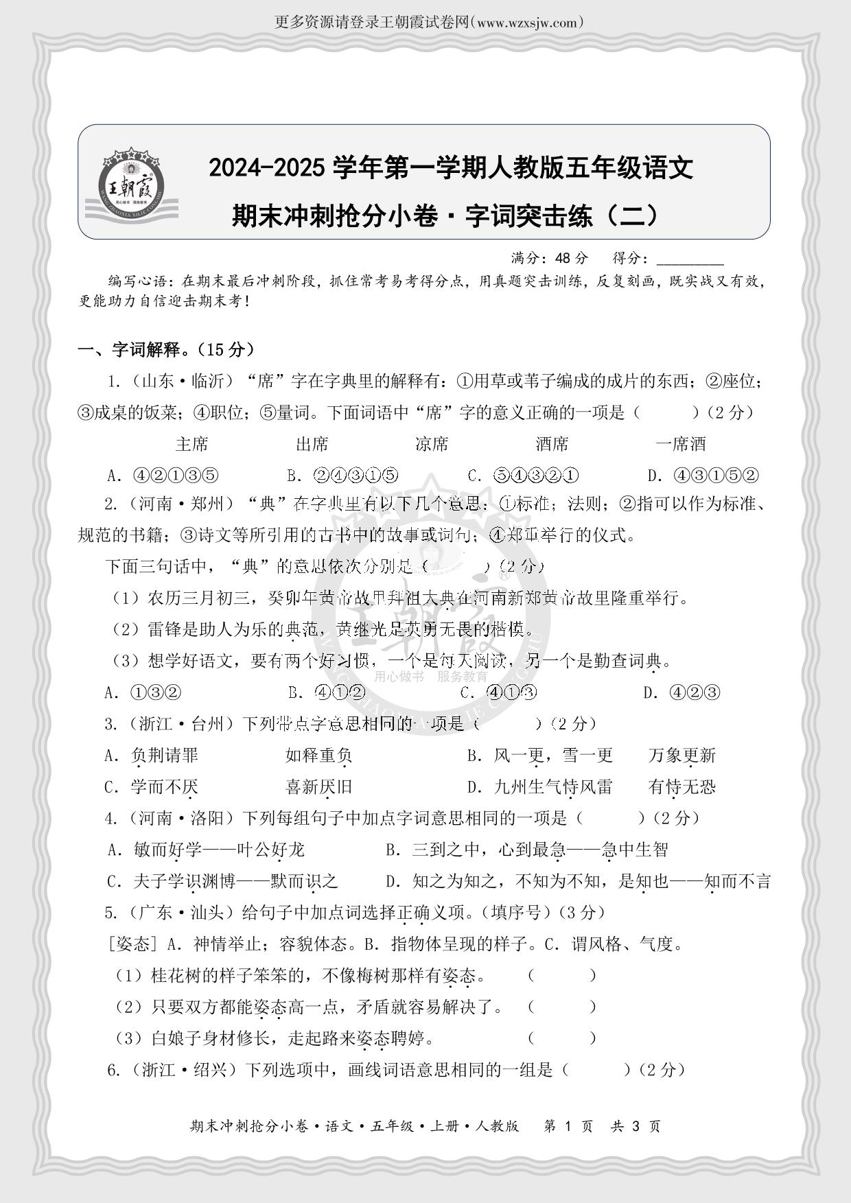 2024-2025学年第一学期五年级语文期末冲刺抢分小卷·字词突击练(二)(人教版)