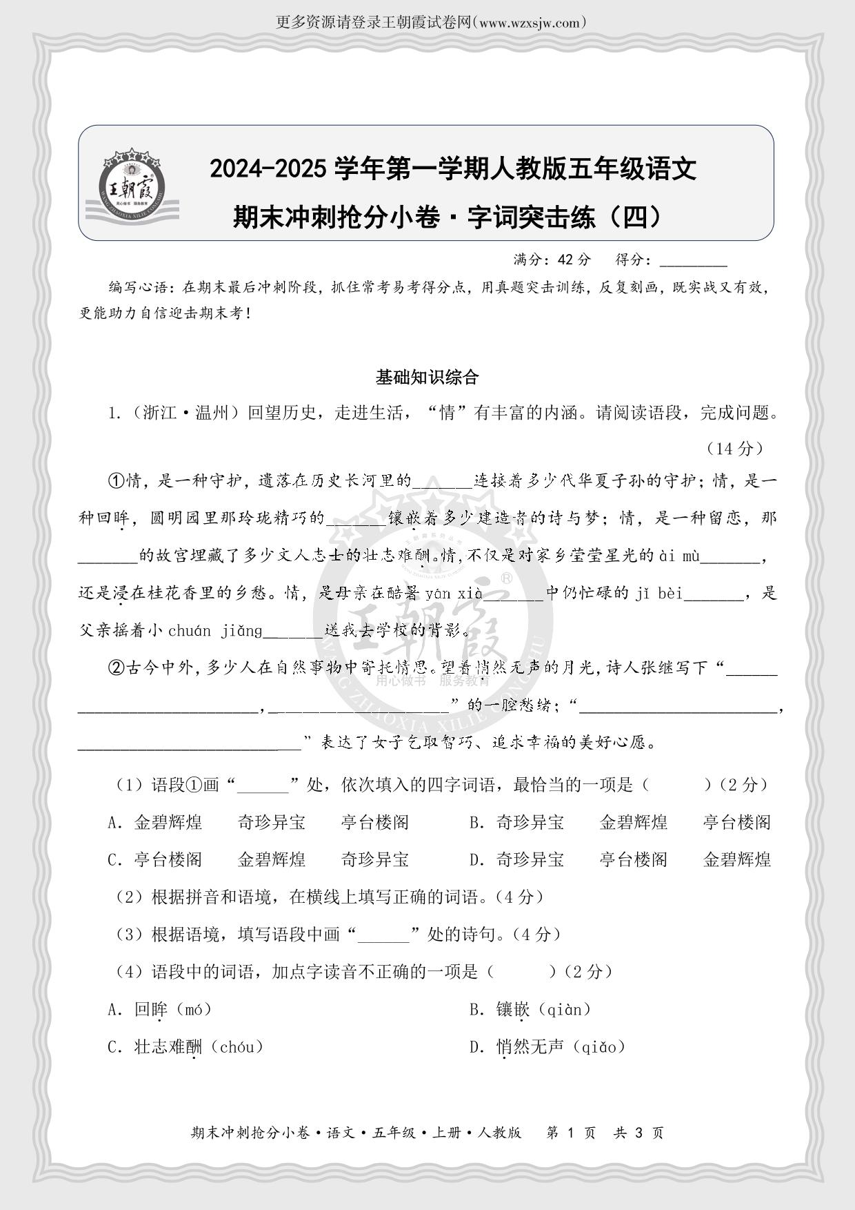 2024-2025学年第一学期五年级语文期末冲刺抢分小卷·字词突击练(四)(人教版)
