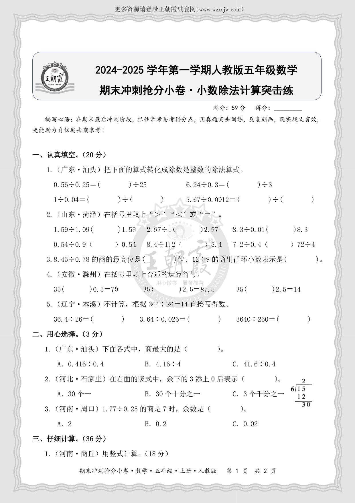 2024-2025学年第一学期五年级数学期末冲刺抢分小卷·小数除法计算突击练(人教版)