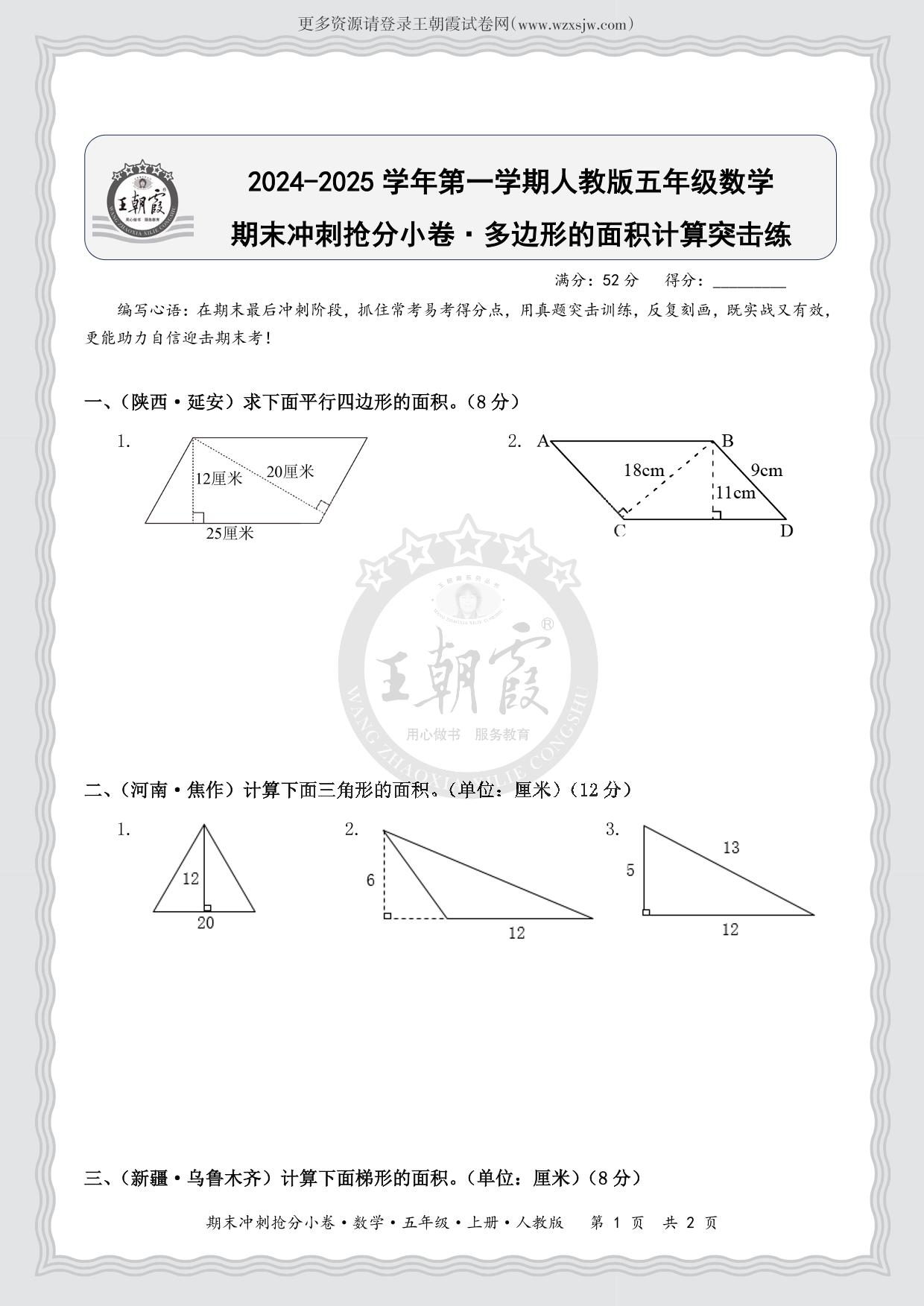 2024-2025学年第一学期五年级数学期末冲刺抢分小卷·多边形的面积计算突击练(人教版)