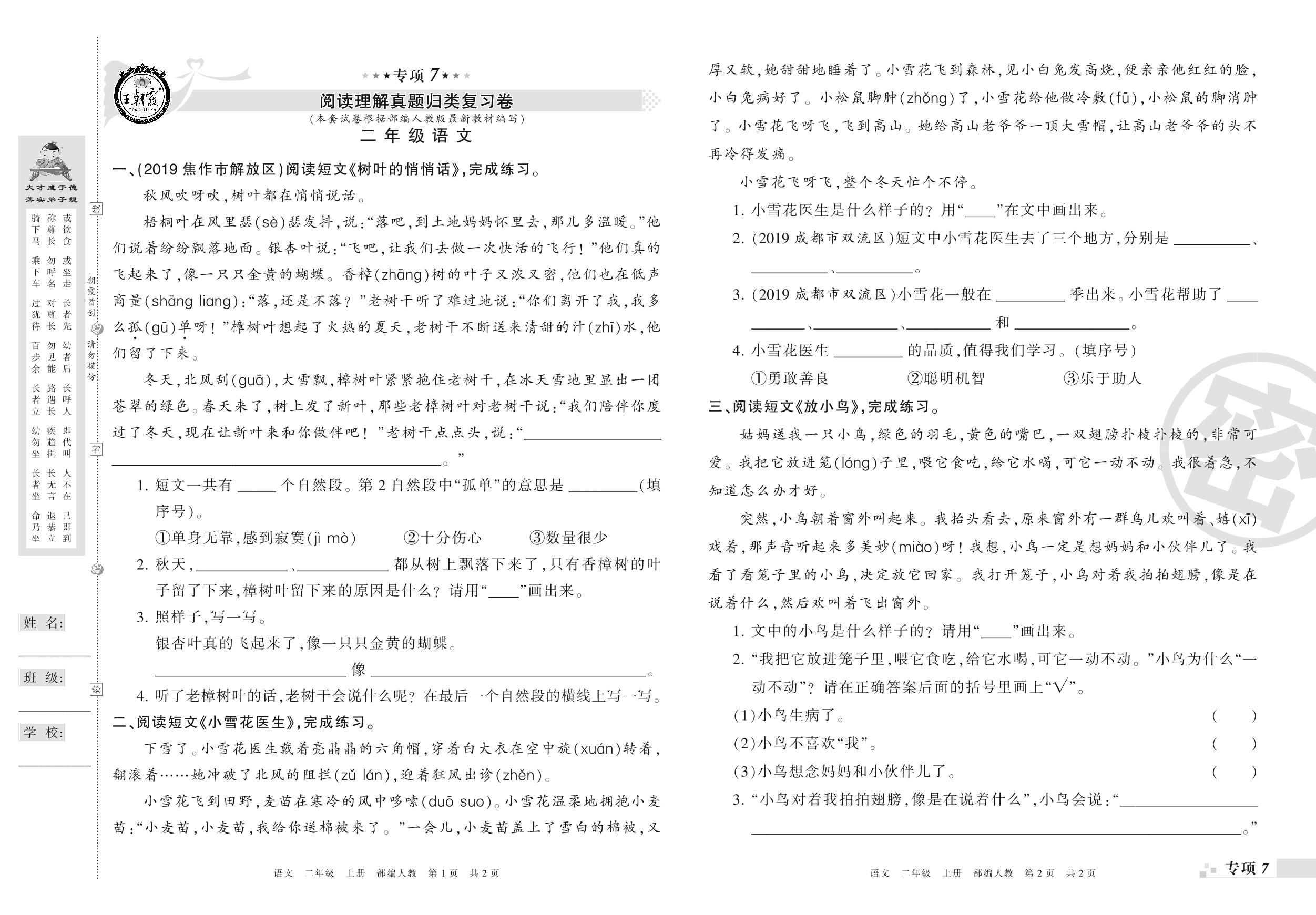 王朝霞期末专项卷——阅读理解、写话真题归类复习卷二年级上册语文(人教版)_R21080171207【0】