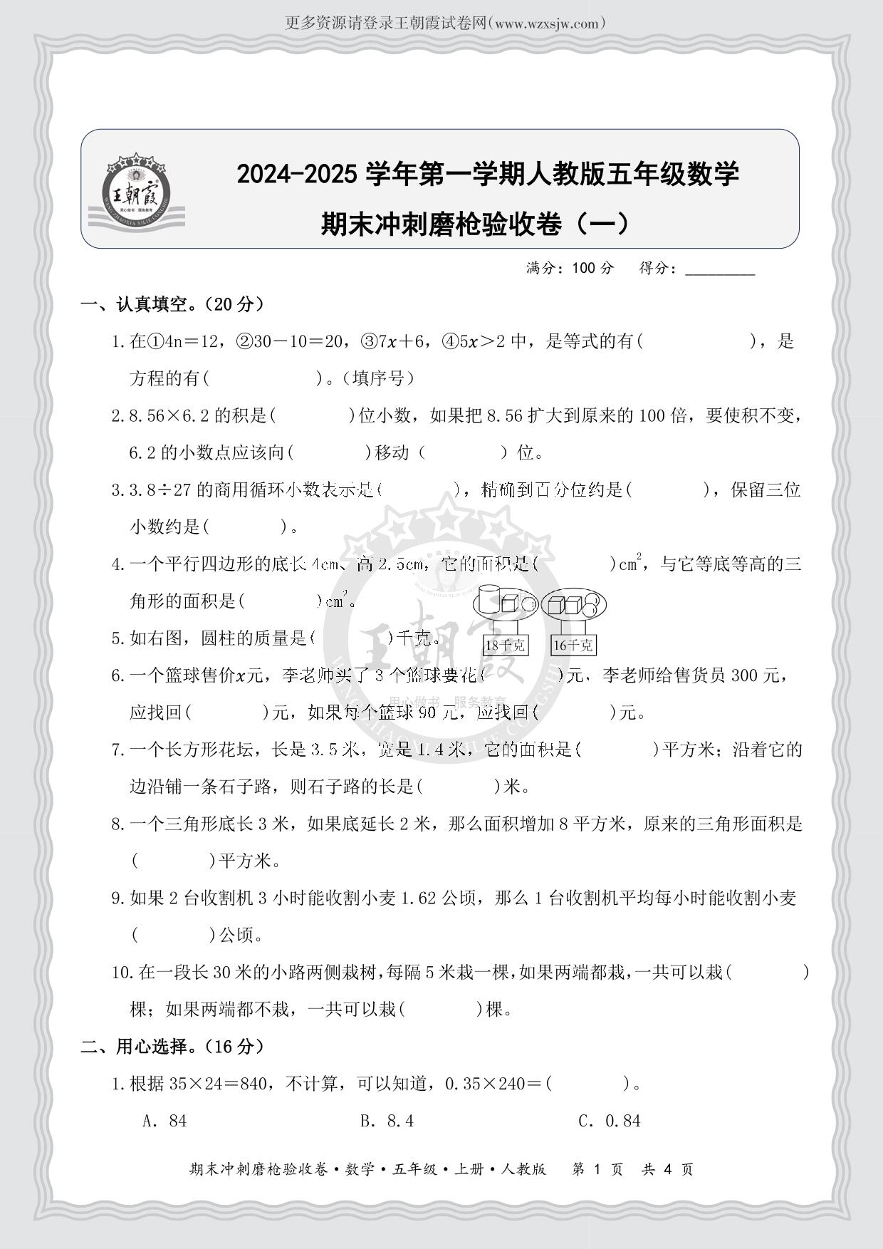 2024-2025学年第一学期五年级数学期末冲刺磨枪验收卷(一)(人教版)