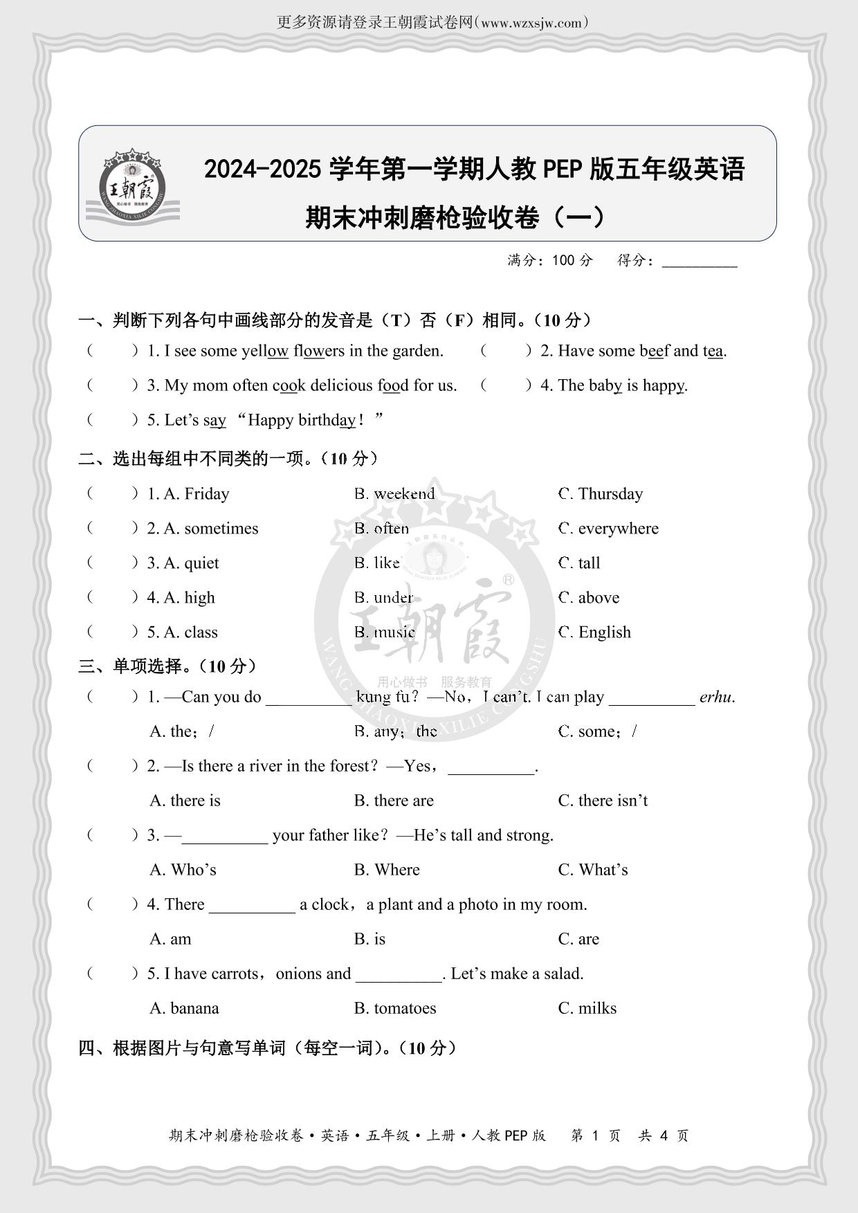 2024-2025学年第一学期五年级英语期末冲刺磨枪验收卷(一)(人教PEP版)