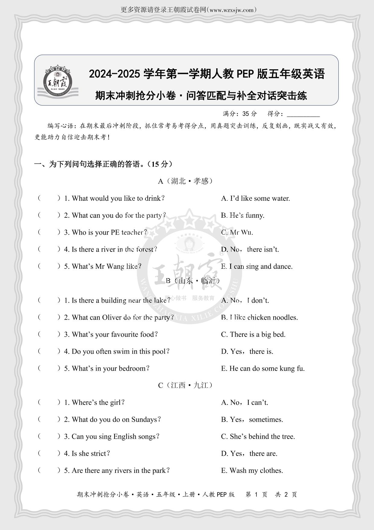 2024-2025学年第一学期五年级英语期末冲刺抢分小卷·问答匹配与补全对话突击练(人教PEP版)